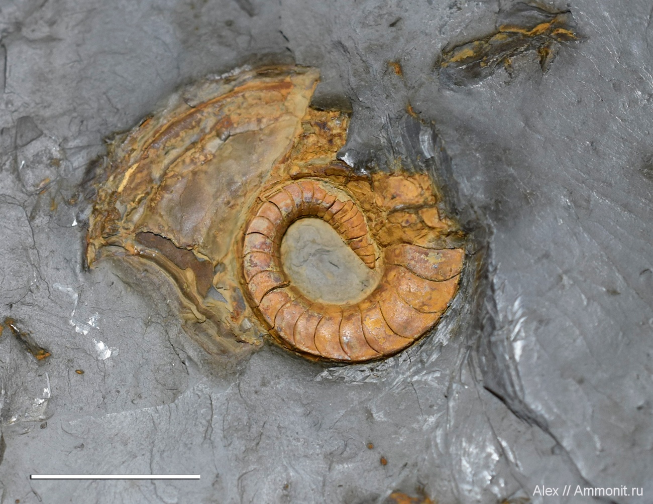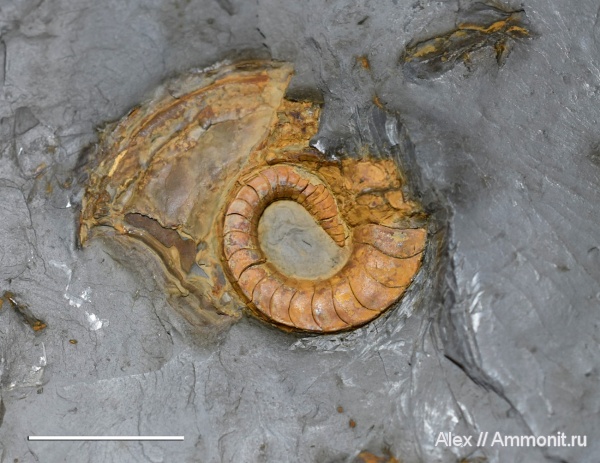 Небольшой наутилус Catastroboceras sp. Длина масштабного отрезка 1 см. Интересно, что в отличие от современных наутилид, появляющихся из яйца с раковиной диаметром 2-2,5 см, эти наутилусы рождались небольшими, вряд ли больше 1 см в длину. Хотя здесь не видно границы эмбриональной и постэмбриональной раковин, седьмая и восьмая камеры фрагмокона явно меньше остальных, а такое сближение перегородок обычно обозначает замедление роста после выхода из яйца - значит, родился он, скорее всего, лишь с шестью камерами. Интересно, что при этом самая первая камера и вовсе меньше 1 мм.