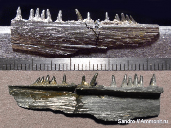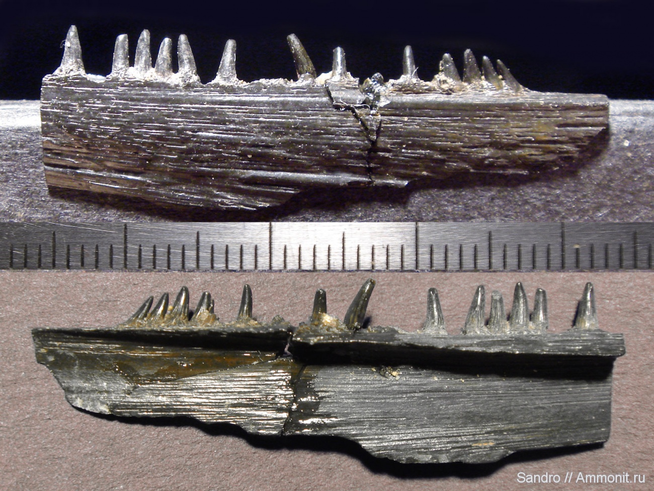 Фрагмент челюсти, а именно зубная кость амфибии. Предположительно Бентозух (Benthosuchus).