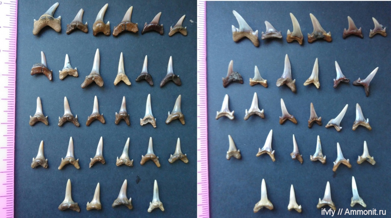 В процессе разбора зубов начинают выделяться зубы рода Eostriatolamia. В основном сортировка состояла в отсутствии или наличии питательного канала. При желании можно отдельно выделить боковые передние и задние зубы, но думаю это лишним. До сбора челюсти ещё маловато, но начало положено. Если де-то ошибся в определении, пожалуйста поправьте.