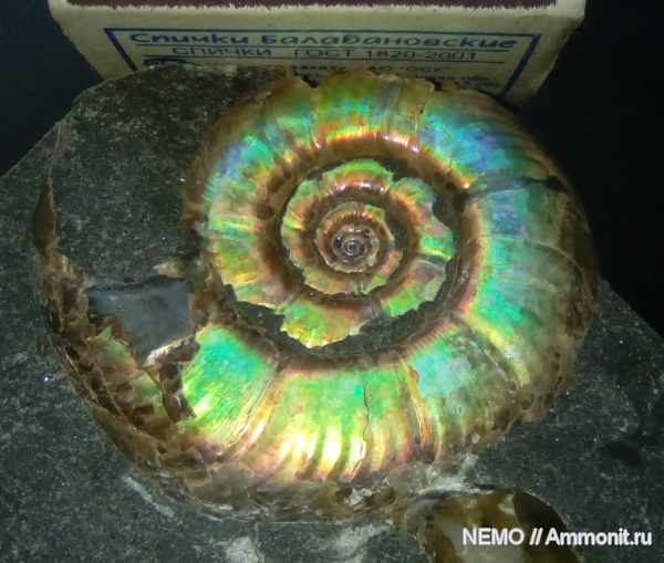 Замечательный экземпляр. Отличный цвет и хороший сохран. Да и в породе лежит красиво. Наверное препарировали? | ||||||