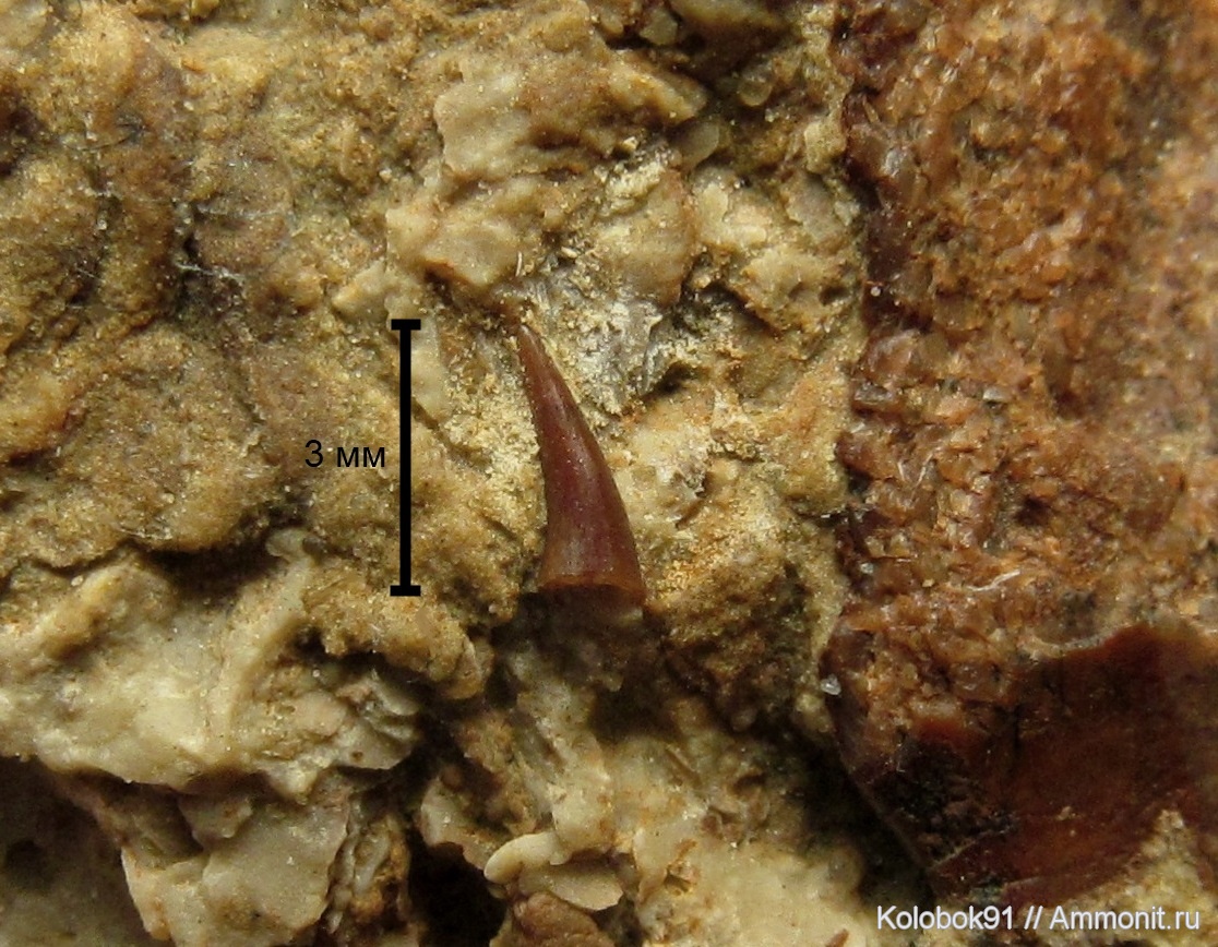 Зуб имеет круглое сечение. Рядом с ним сильно потрёпанный щиток плакодермы.