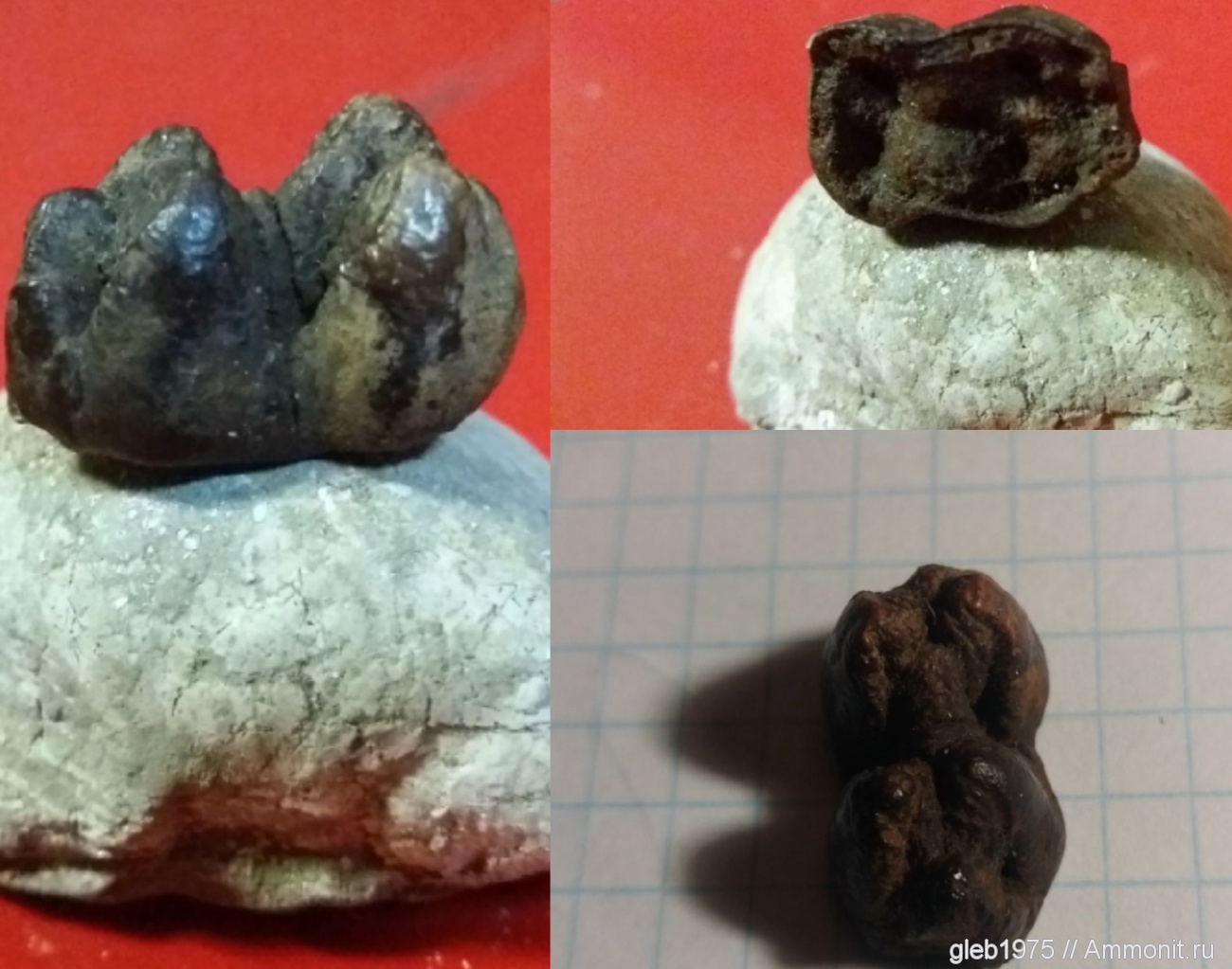 Это скорее окончание корня зуба жвачного какого-то, судя по тому, как он окатан - ледник тащил. По такому фрагмену специалисты могут даже не сказать точно. Датировка, мб плейстоцен, а мб и 2000-3000? | ||||||