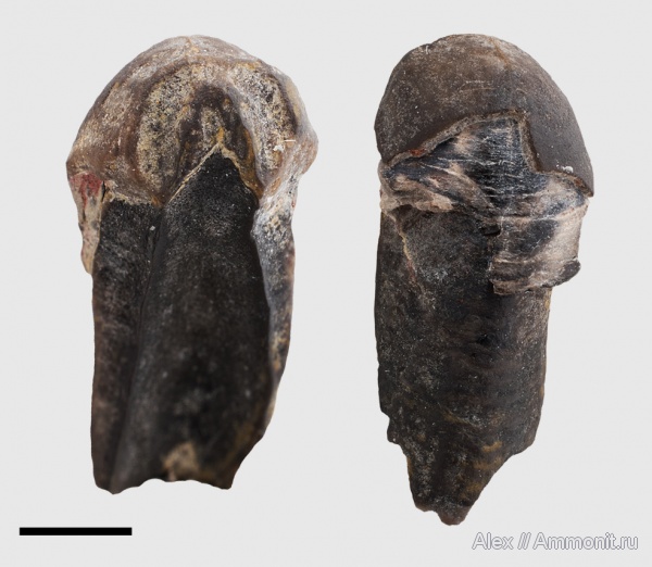 Длина масштабного отрезка на фото 2,5 мм. Между "рукояткой" и "капюшоном" конхоринха сохранился фосфатизированный фрагмент органичской части челюсти (видно на правом фото).