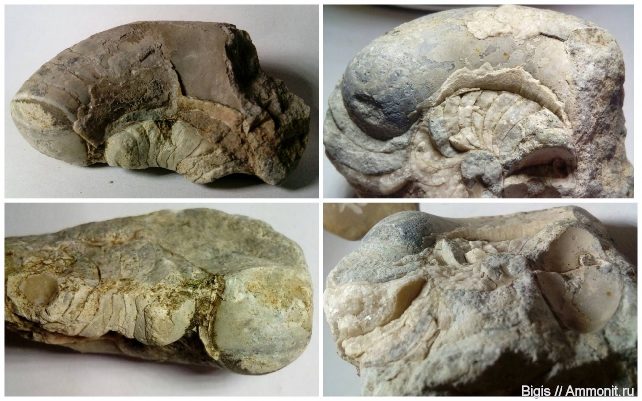 Еще два Estonioceras. На торцах видны сифоны(у левого видно плохо на фото, он расположен в верху). На обоих раковинах в верхней части видна жилая камера. В месте перехода есть не большое сужение раковины. На фото не удалось это изобразить, на левом если приглядеться то можно увидеть.
