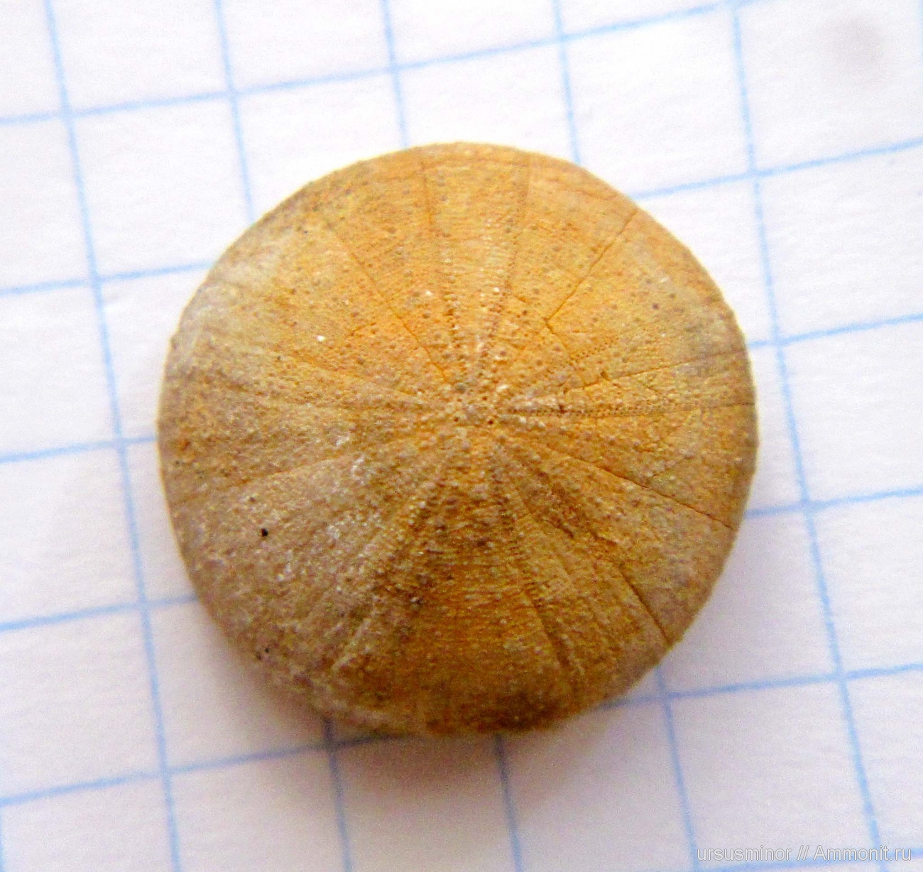 Нижнеготеривский морской еж Discoidea karakaschi с необыкновенной сохранностью панциря. Видны все таблички, туберкулы, дырочки и поры. Макро фото сверху, фото и макро фото снизу (на всех фото еж повернут передом вверх), фото сзади. Такой попался впервые. Крым, Бахчисарайский район.