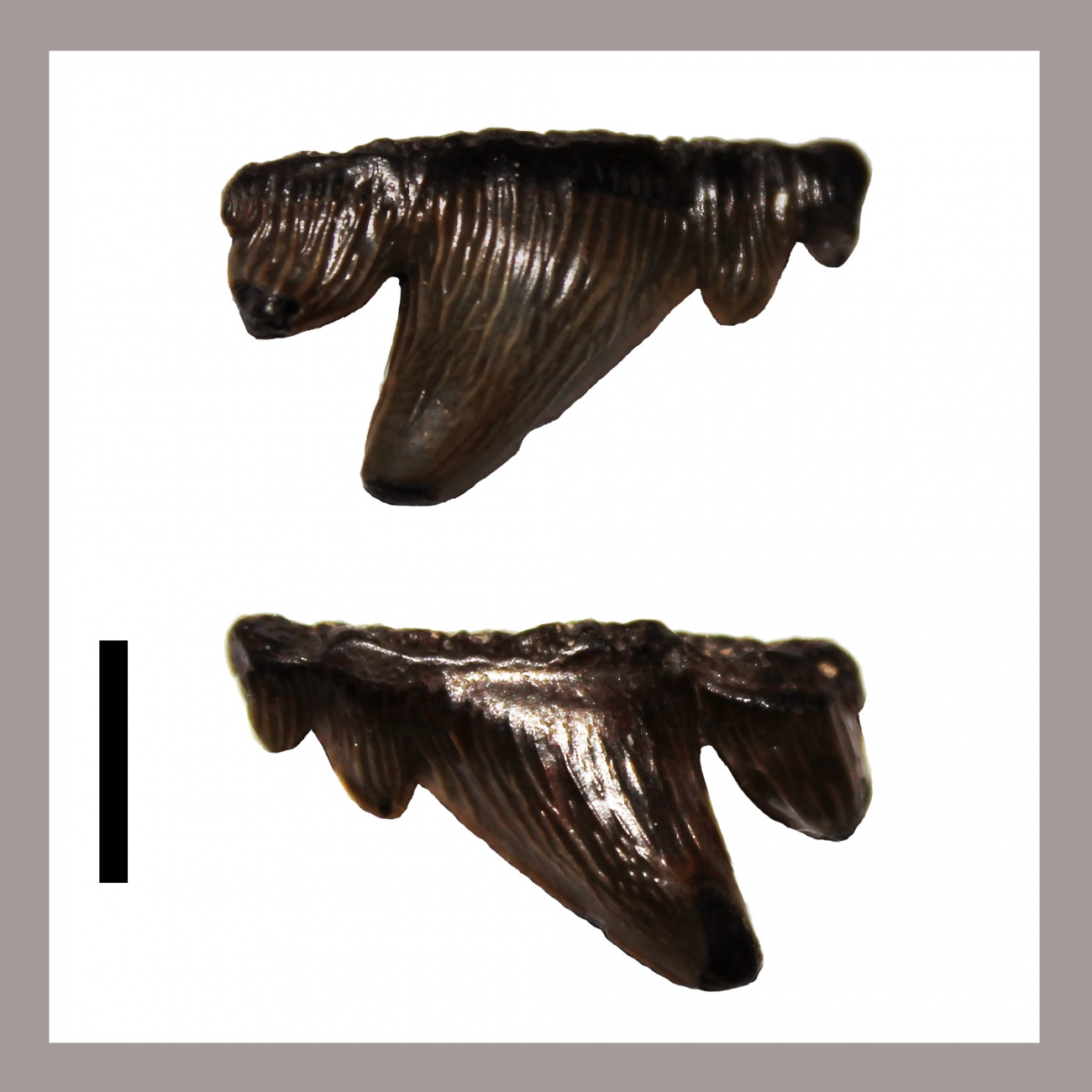 Интересный зуб гибодонта из келловейских глин Трахтемирова. Подобные зубы были описаны Роговичем, 1860 как Hybodus reticulatus, хотя этот вид на самом деле нижнеюрский (Agassiz, 1843). Думаю, что это представитель собственно рода Hybodus, несмотря на сходство силуэта с Secarodus, у последнего сильно лабио-лингвально сплющенная коронка в отличие у этого зуба, двояковыпуклого.
