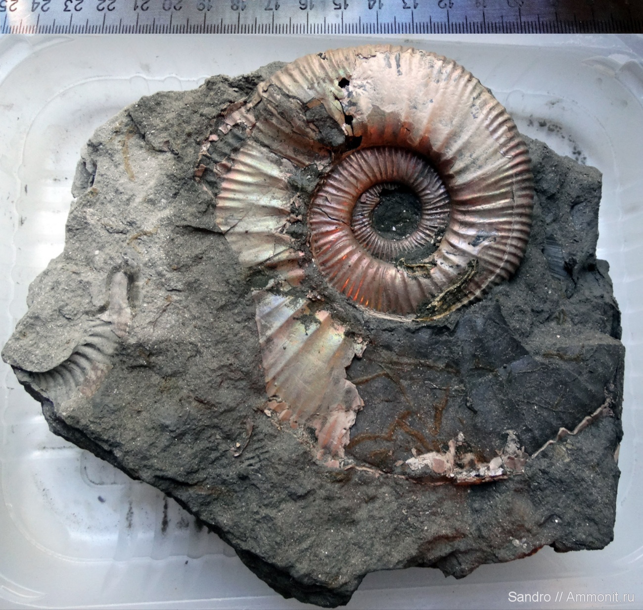 На плитке присутствует отпечаток жилой камеры микроконха Binatisphinctes с сохранившимся ушком.
