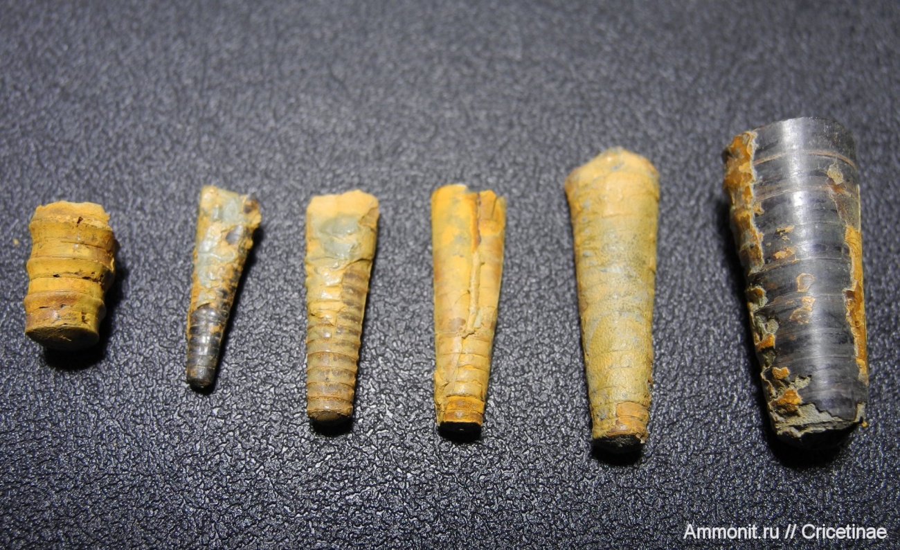 Прямораковинные головоногие Orthoceras и Cycloceras (крайний слева). Размер от 1 до 2,2 см.