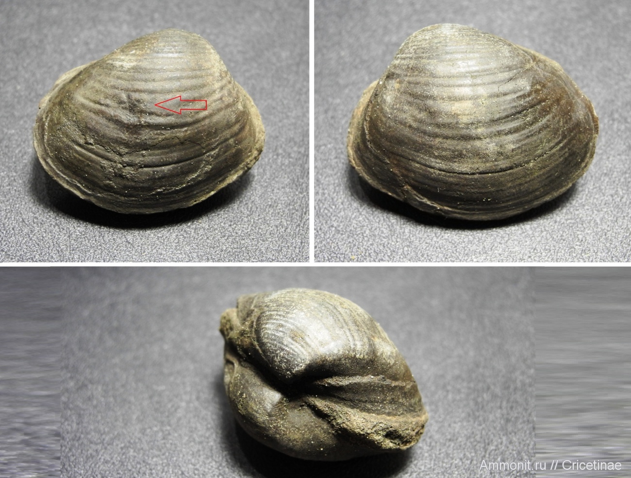 Довольно хорошей сохранности фосфоритовое ядро двустворки со следами прижизненного повреждения (отмечено стрелкой). Размер 5 см.