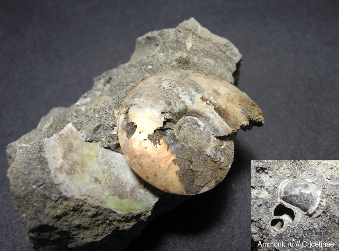 Аммонит Garniericeras. На обратной стороне конкреции оказалась гастропода (фото в углу). Размер аммонита 4 см см, размер гастроподы 1,5 см.