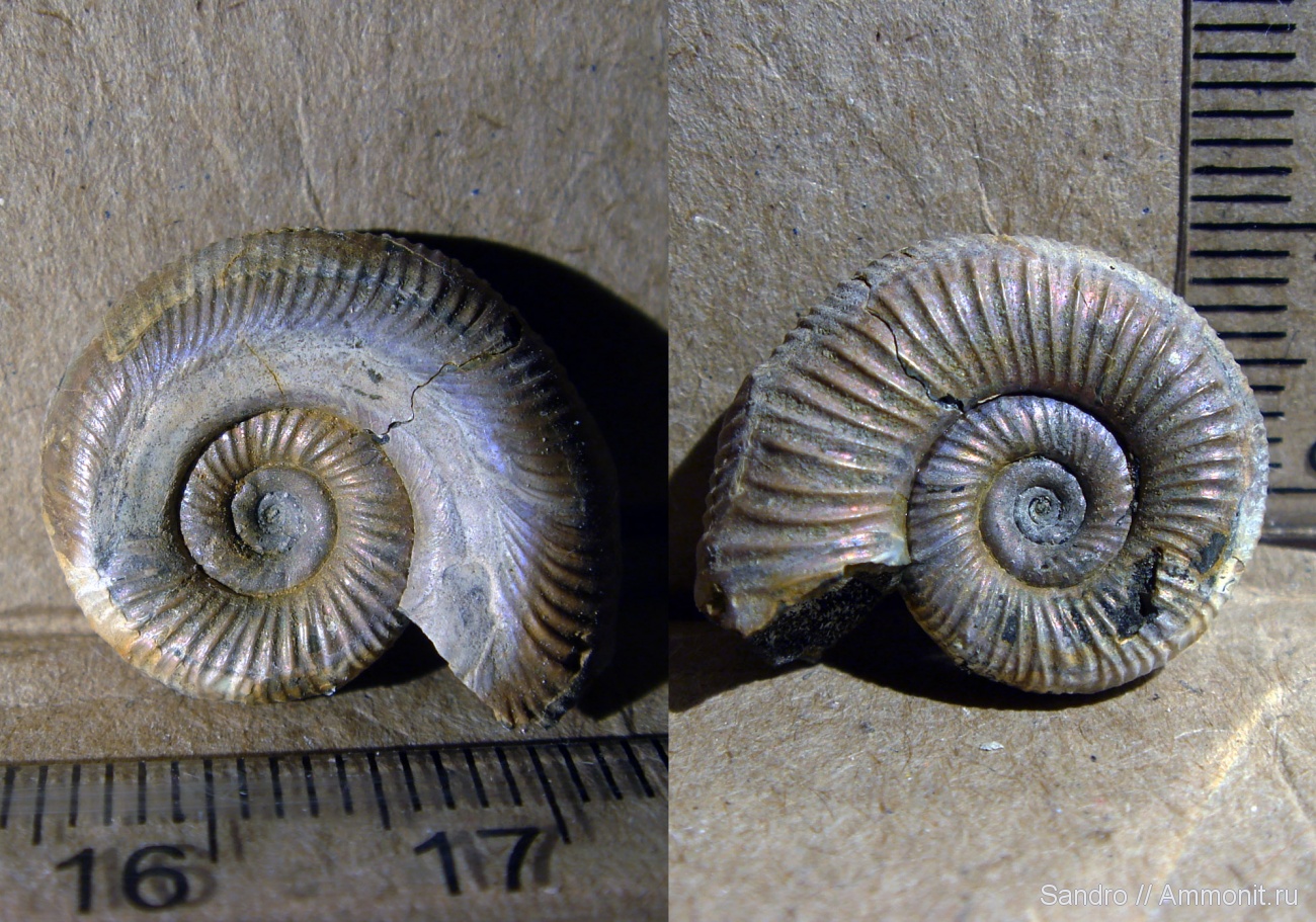 Фрагмокон небольшого аммонита Binatisphinctes, который был укушен в раннем детстве. Две стороны одной раковины - а какая большая разница в скульптуре рёбер.