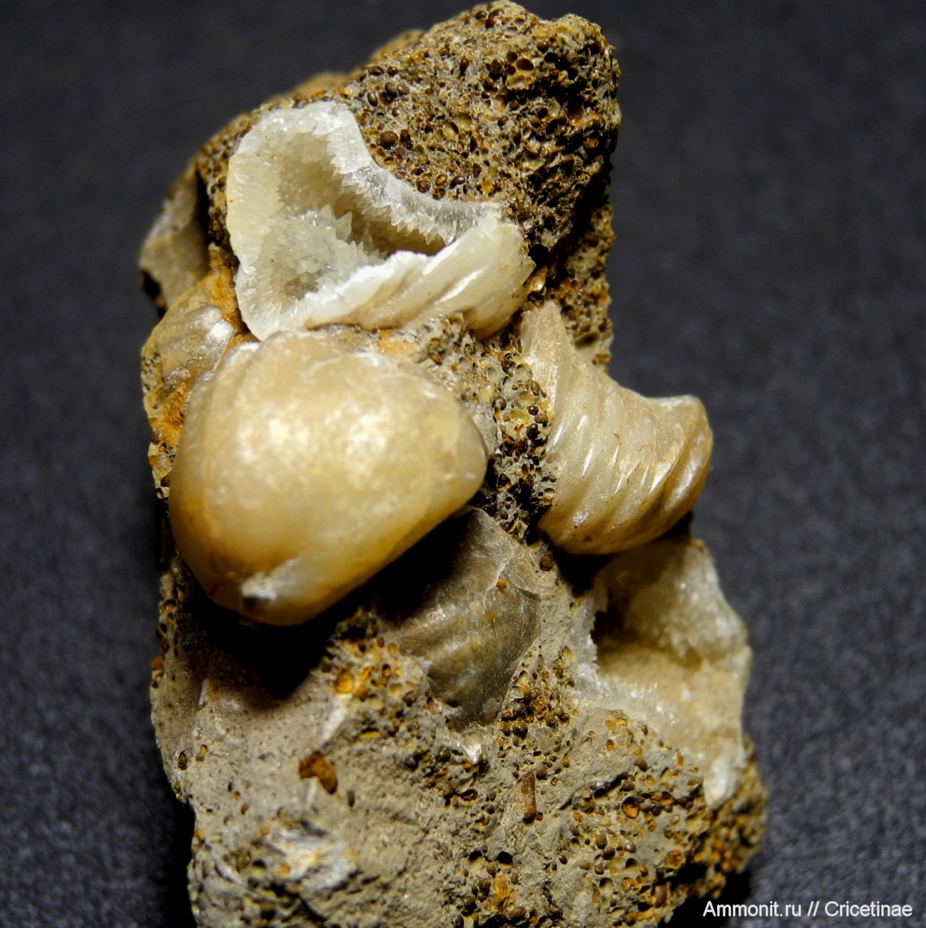 "Банка" с брахиоподами Ivanoviella alemanica в мергелевой конкреции. Размер брахиопод около 1,5 см, размер банки 5,5 см. Внутри брахиоподы превратились в кальцитовые жеоды.