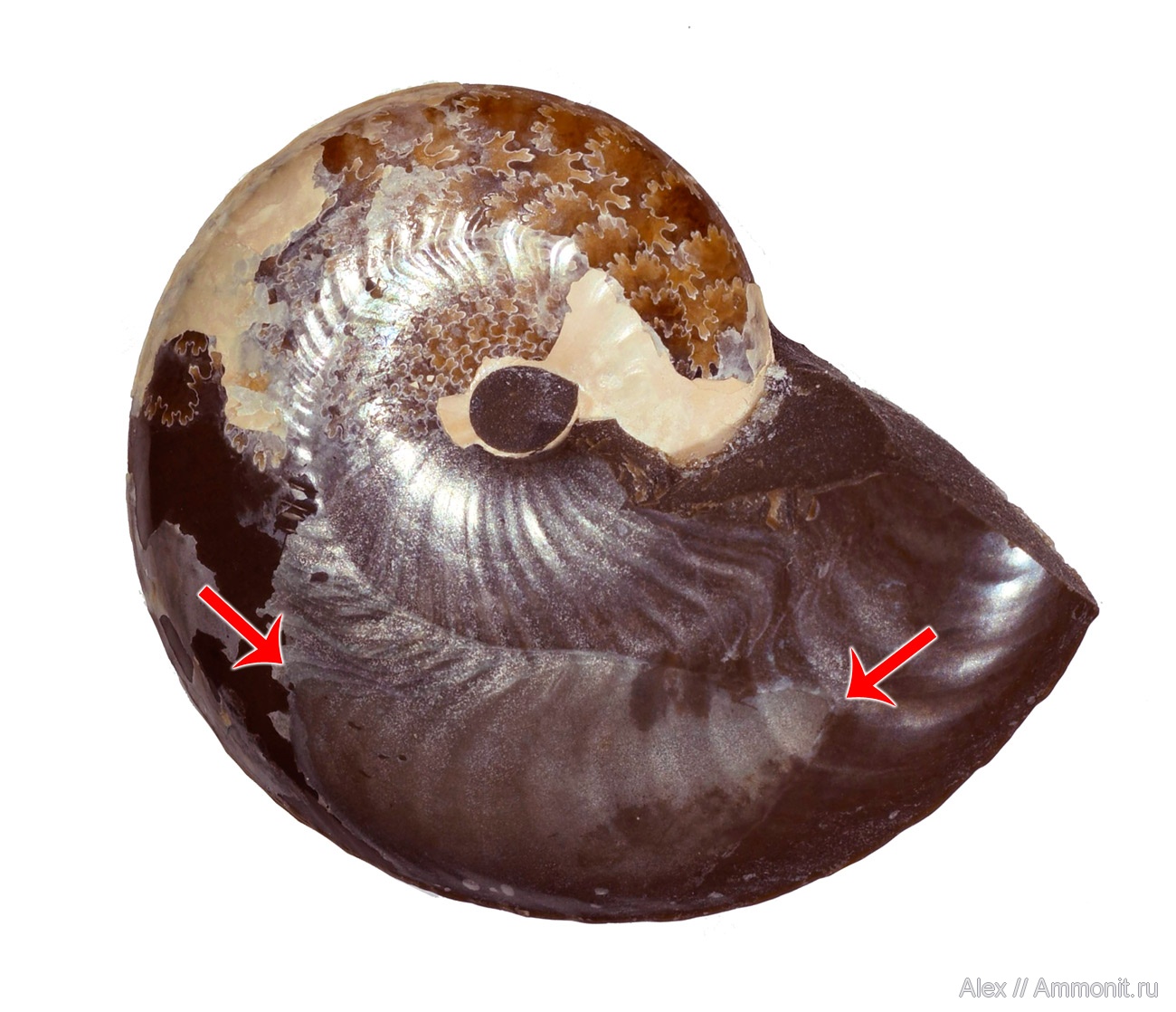 Давно у нас на сайте не было отпечатков мускулов аммонитов :) На этом фото - латеральный отпечаток мускула в жилой камере аптского аммонита Sinzovia (он же изестен как Aconeceras). Задняя и передняя точки отпечатка указаны стрелочками. Латеральные (иногда их называют вентро-латеральными) - самые крупные из аммонитовых отпечатков мускулов, их длина составляет от трети до почти половины длины жилой камеры. К ним, скорее всего, крепились мощные мускулы-ретракторы воронки аммонитов. Диаметр аммонита 3 см.