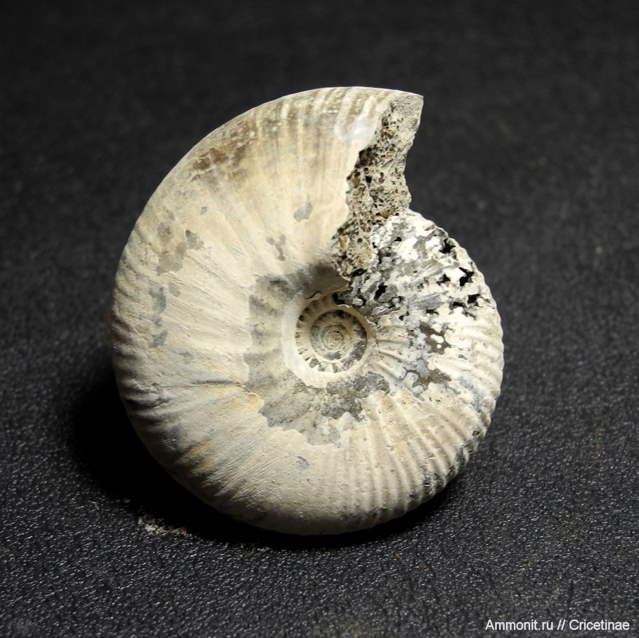 Небольшой но хорошей сохранности аммонит Rondiceras tcheffkini. Размер 4 см. Белый налёт это остаток перламутра.