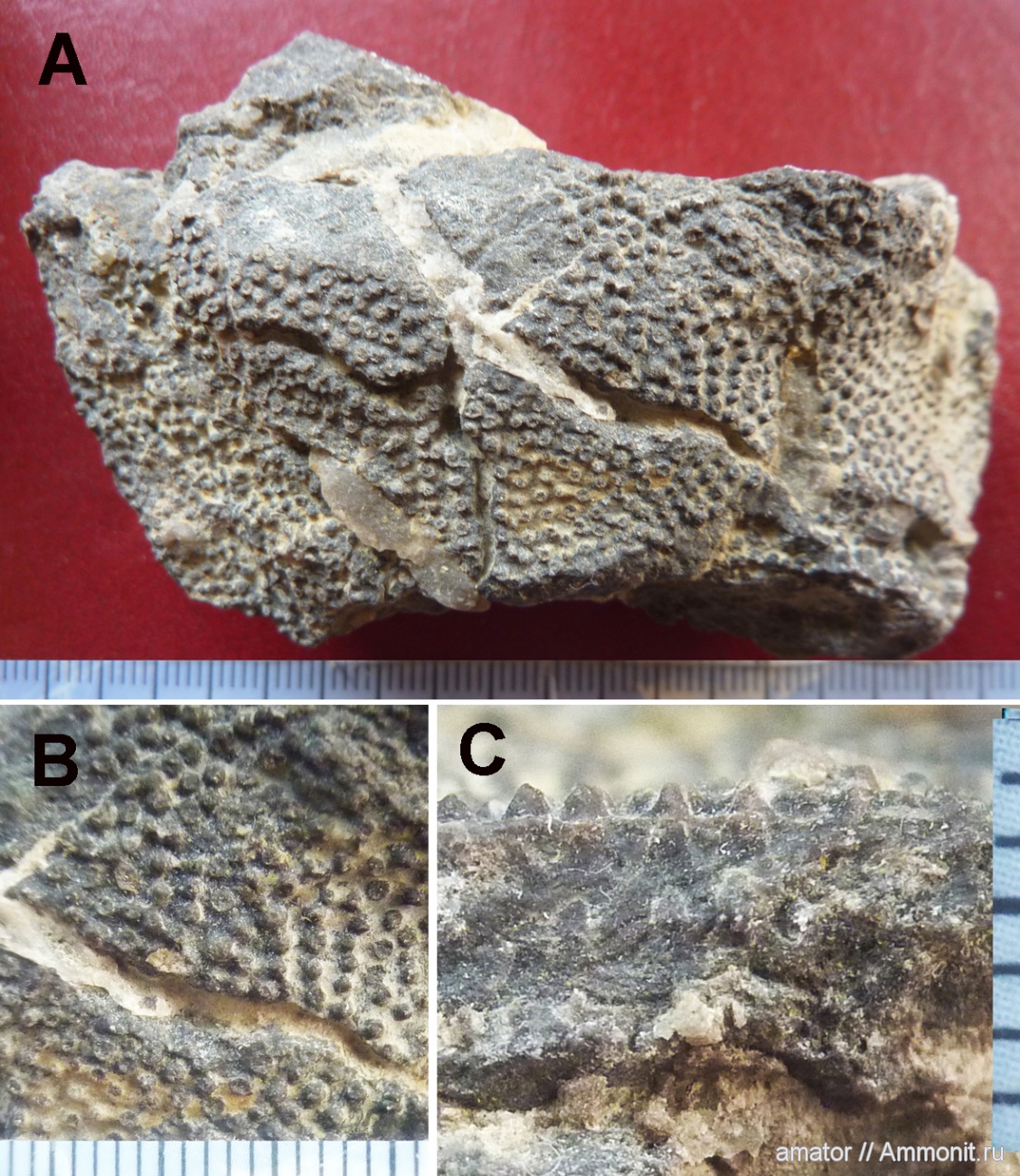 Когда роешся в Девоне и Силуре, сердце екает, если на глаза попадается камень с "пупырчатой" поверхностью. Сразу возникают мысли о панцыре. Так было и с этим образцом. Однако после небольшой расчистки оказалось, что никаким панцырем тут и не пахнет. Предполагаю, что это известковая водоросль Mastopora (прошу поправить, если не прав) Я про них почти ничего не знаю. Мне показалось интересным, что на сломе (Рис. С) довольно четко видны силуэты как минимум двух "пупырчатых" слоев, лежащих под поверхностным.