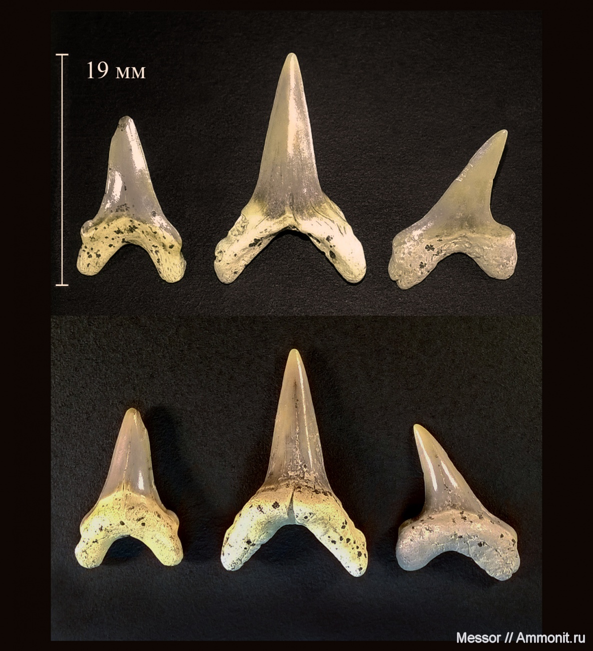 У всех акулятников на сайте есть Paranomotodon, а у меня нет. Это надо исправить. Вот, был день, попалось три штуки кучно. Центральный зуб вне сомнений и подозрений, а мелкие, теоретически, могут быть и "ложными лисичками" - юными кретоксеринами. Высота наибольшего зуба - 19 мм. Дополнительный ракурс: Фото