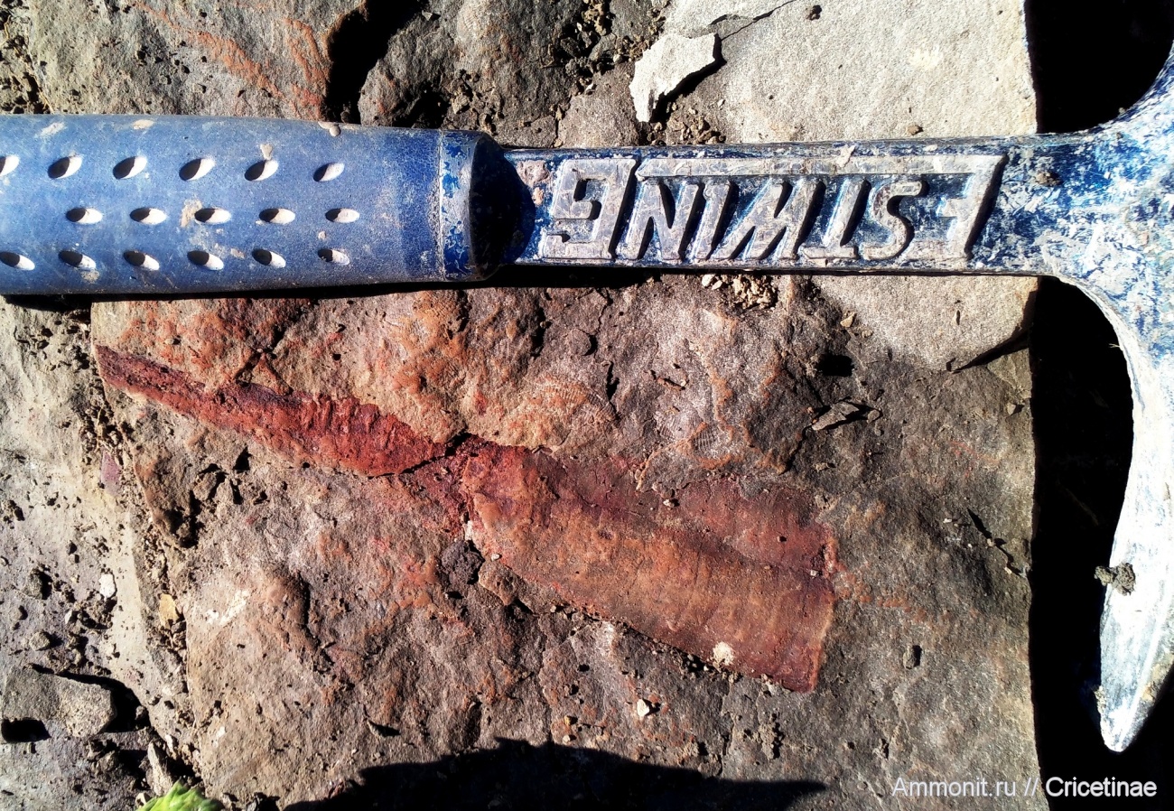Крупный, но к сожалению давленый и "неизвлекаемый" Orthoceras. Размер около 20 см. Примечательно, что найден не в стешевской глине, а в "зубном" алевролите.