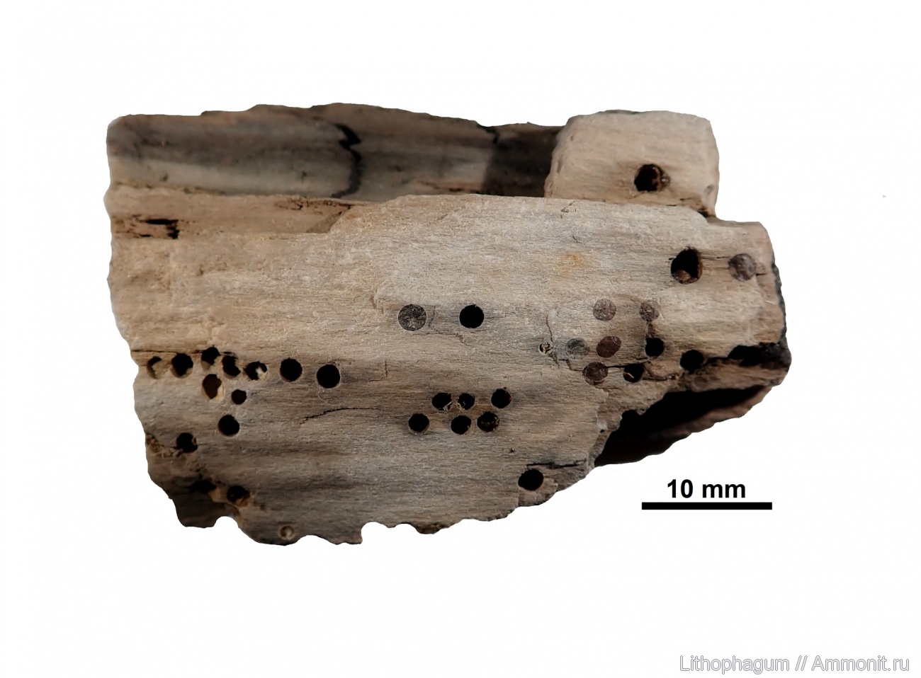 Фрагмент окаменевшей древесины, предположительно из хвойных (Plantae: Pinophyta), с повреждениями от жизнедеятельности ксилофагов (древоточцев). К сожалению, не представляется возможным узнать, эти повреждения от наземных животных (например, насекомые) или же от водных (например, моллюски или изоподы), уж после того как древесина попала в воду.