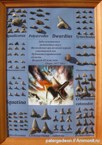 Dwardius,Cretoxyrhina и Ptychodus - верхний сеноман (Александровка),Squalicorax kaupi - кампан (Карякино),остальные средний сеноман (Пудовкино)