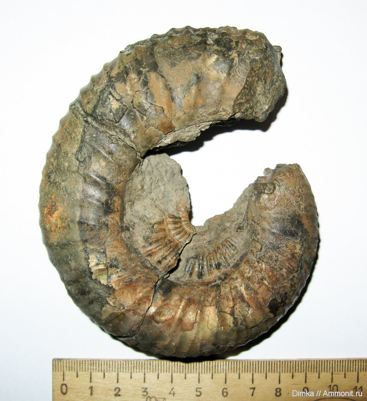 Этот амммонит с более ребристой скульптурой, так же сохранился с жилой камерой.