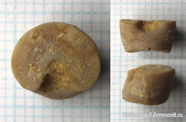 Фрагмент стебля морской лилии со следом прикрепления проблематичного эпибионта Phosphannulus. Для Phosphannulus характерно одиночное воронковидное углубление в стебле, который в этом месте обычно бывает утолщен из-за разрастания скелетной ткани, это реакция морской лилии на поселение эпибионта. Фасетка, по которой этот фрагмент отделился от остального стебля, проходила по воронке. Благодаря этому воронка получилась "в готовом разрезе". Скелет самого фосфаннулуса здесь не сохранился, чаще всего так и бывает, он маленький и хрупкий.