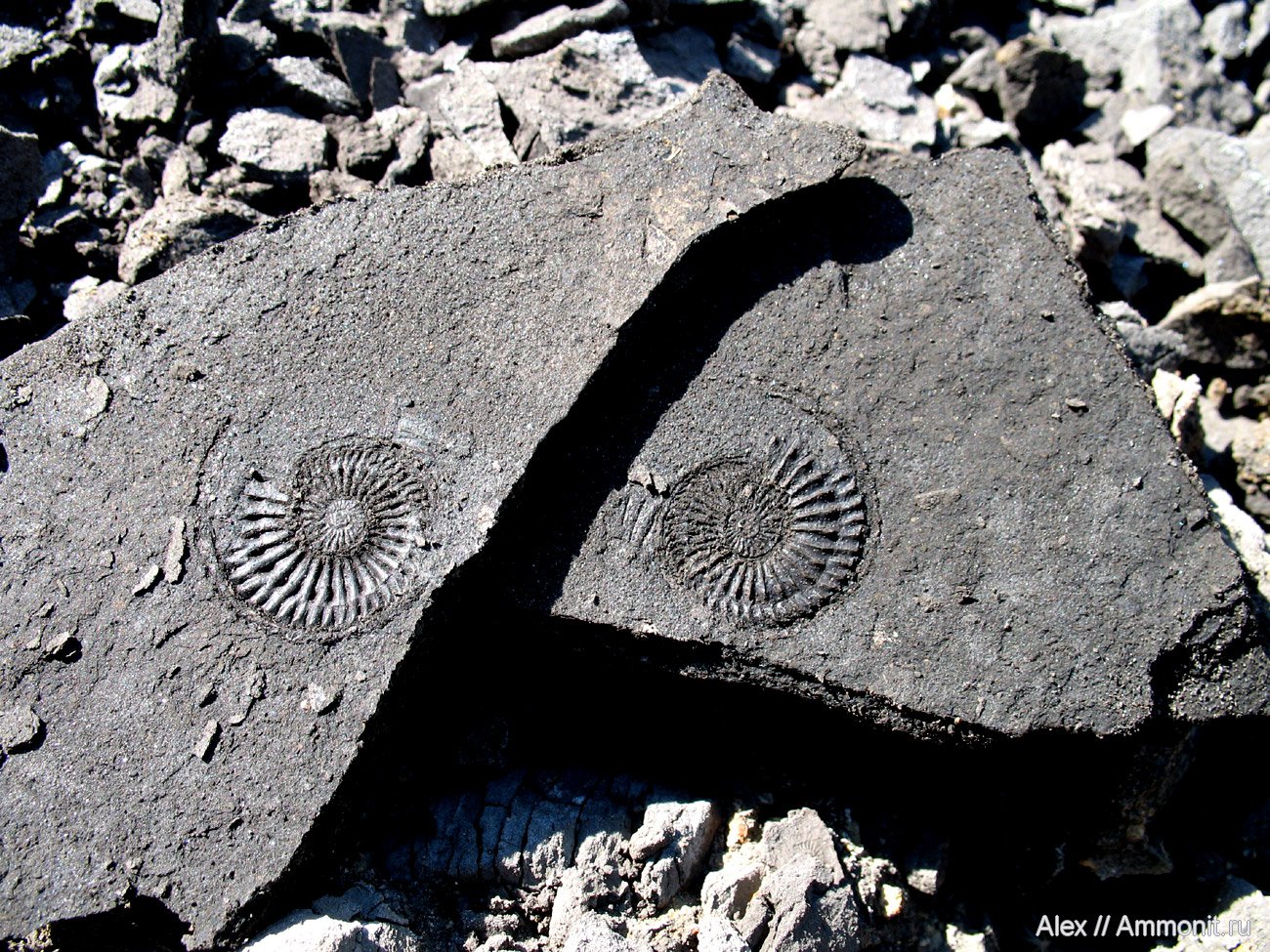 В юрских породах, которые доступны в Голутвинском карьере, сложились очень странные условия сохранности аммонитов - их раковины растворились без остатка, остались лишь слепки - отпечатки. Иногда они покрыты остатками перламутра, иногда - как в данном случае, нет даже и этого.