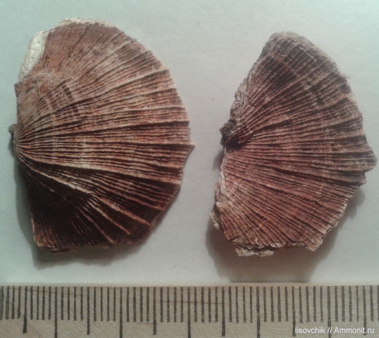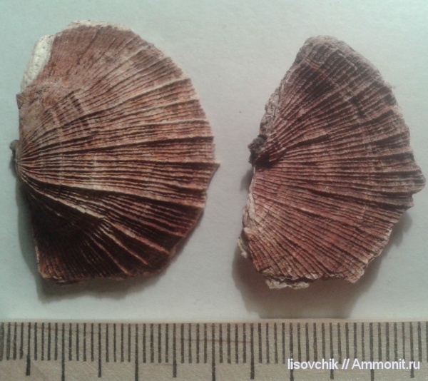 Спинная створка (слева) Schellwienella crenistria (Phillips, 1836). Справа то-же, только фрагмент брюшной створки. | ||||||