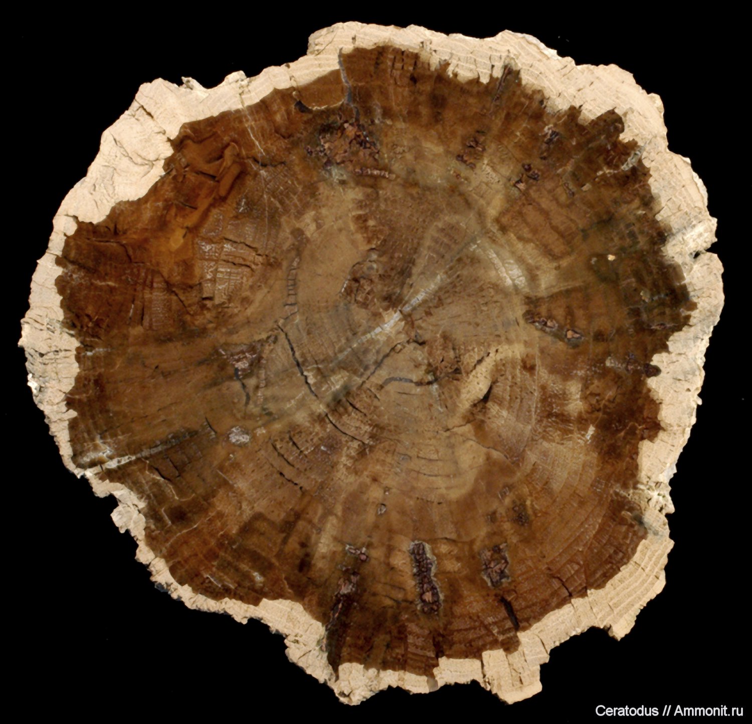 Типичный образец окаменевшенй древесины из McDermitt deposite, штат Орегон. В агатизированной пористой древесине хорошо различимы годовые кольца. Размер образца 14.5х14 см, толщина 11 мм.
