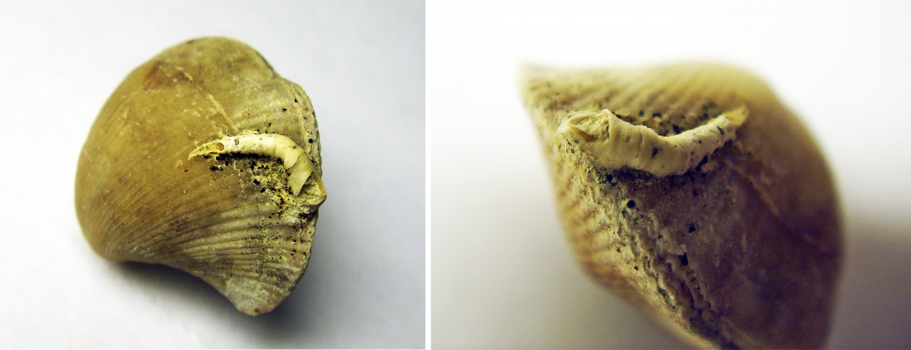 Попался нетипично длинный Cornulites sp. на створке брахиоподы Theodossia. Видимо условия произрастания были благоприятными и трубочка червя не спешила возвышаться над раковиной брахиоподы долгое время.