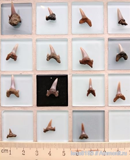 Практически все зубы Archaeolamna. Номер 7, по-моему, Eostriatolamia. И номер 10 может оказаться молодой кретоксириной. Лучше было разместить зубы в два ряда, тогда зуб номер 11 вошёл бы в кадр. | ||||||