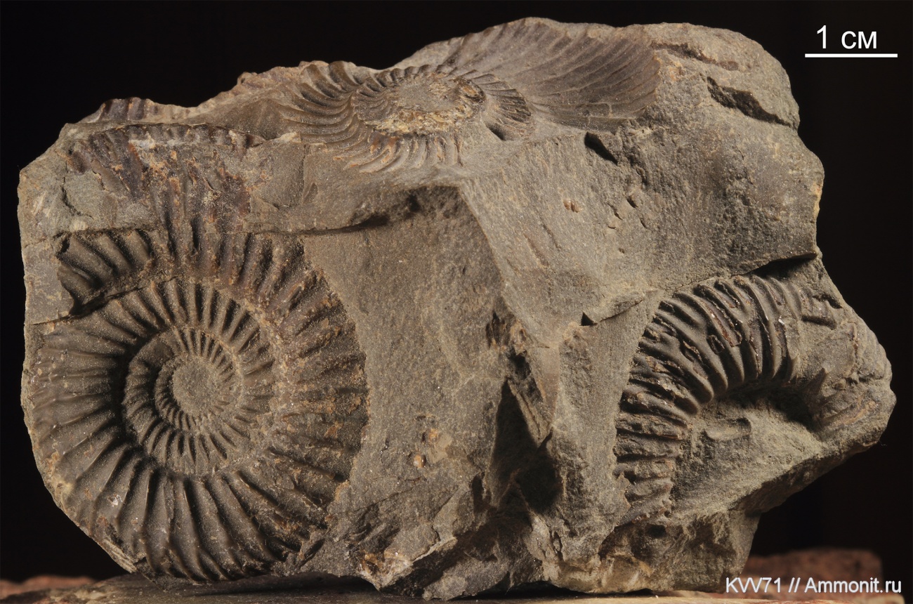 Иногда встречаются не одиночные паркинсонии, находящиеся в правильной формы конкрециях (сферических или эллипсоидных), а в "банках", совершенно неправильной, любой формы. Там может быть множество аммонитов. Извлечь их всех у меня не получается. Здесь после разлома конкреции видно три аммонита.