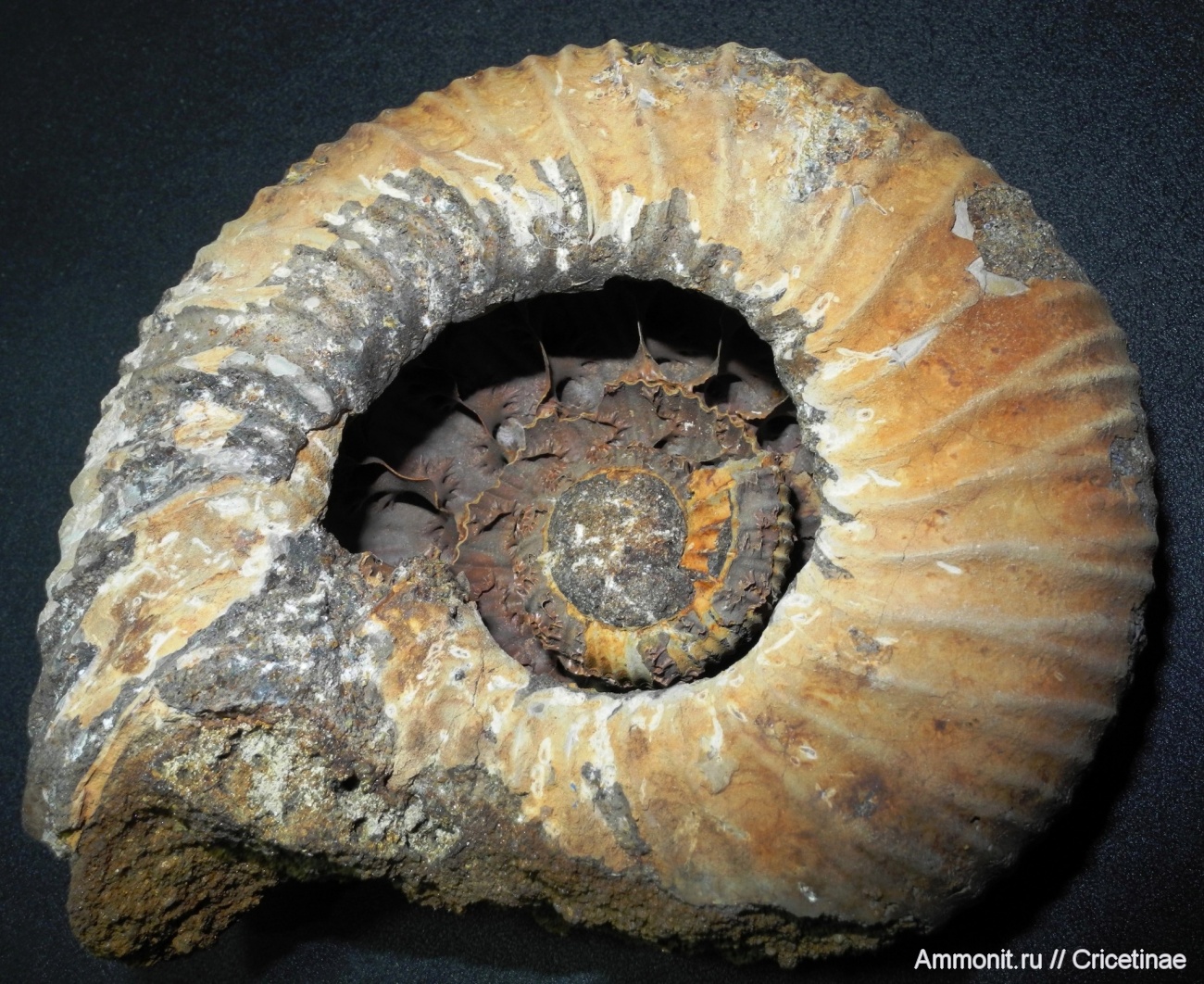 Забавной сохранности аммонит Epivirgatites, где песчаником заполнилась серединка аммонита. Размер 14,5 см.