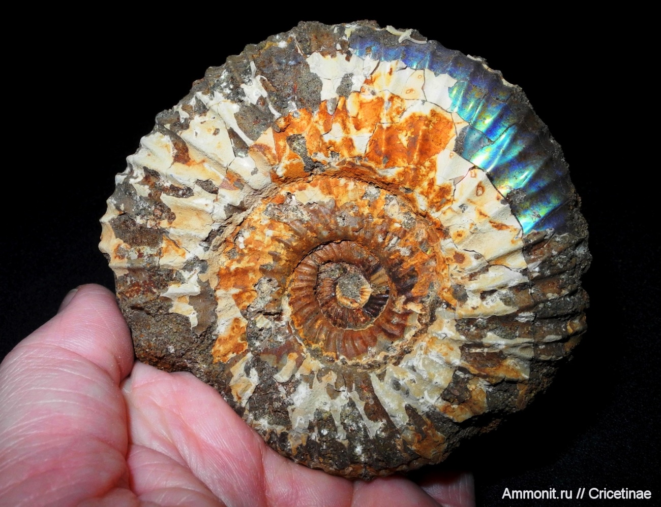 Этот небольшой для тех мест аммонит примечателен тем, что у него сохранилось часть перламутра синего цвета, что очень большая редкость для Мостово-Василво и Глебово. Размер 9,5 см.
