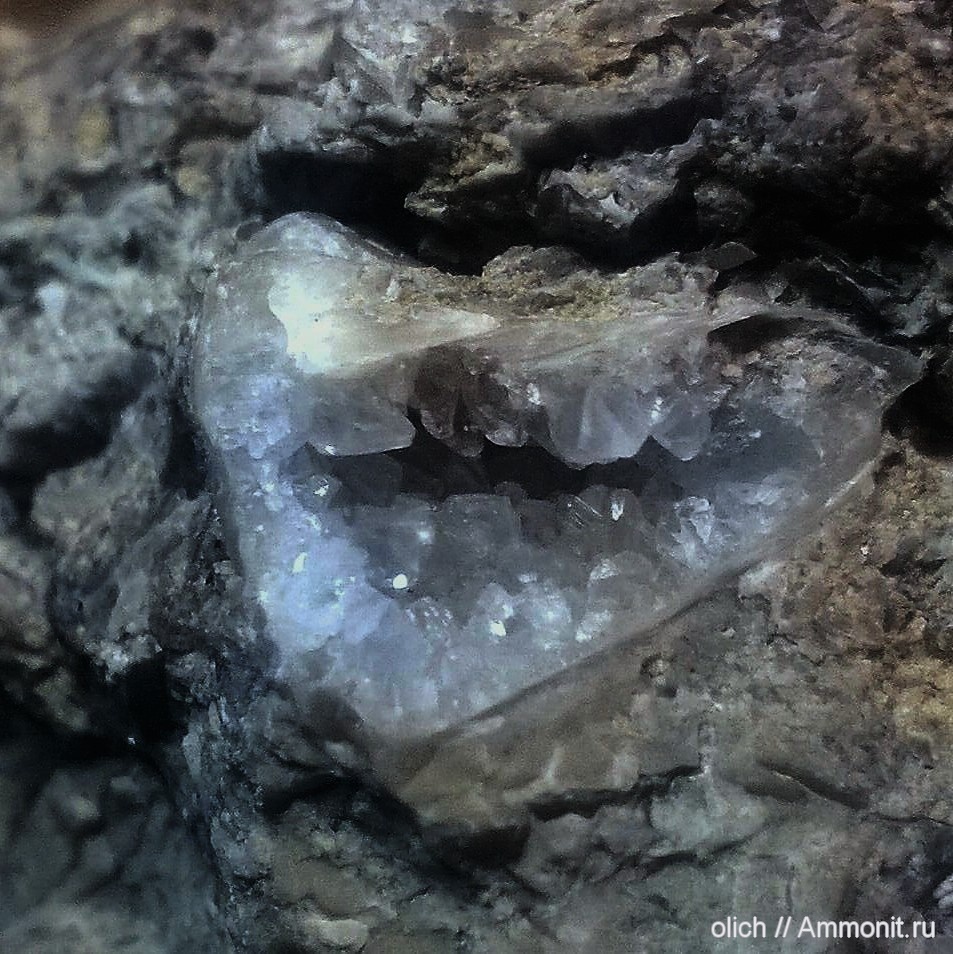 Да, целую конечно хотелась бы. Но все мои попытки достать из породы в случае с другими подобными экземплярами, не очень хорошо заканчивались))) кристаллы либо мутнеют, либо вовсе растворяются.. Эту не трогала, цвет кристаллов мне даже чем то напоминает кварц по типу горного хрусталя - холодный белый ( прозрачный) с синевой. | ||||||