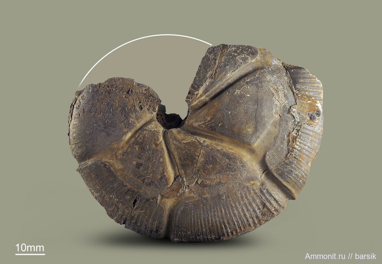 Жилая камера аммонита из подотряда филоциатид Holcophylloceras zignodianum (Мужская особь). Вид условно делится на мужские и женские особи в зависимости от округлости оборотов, глубины и длинны языковидного углубления от пережима и вида перехода пережимом вентральной или брюшной стороны.Нижняя часть зоны Parkinsonia parkinsoni (подзона Acris [=Subarietis]) верхнего байоса р. Кяфар.