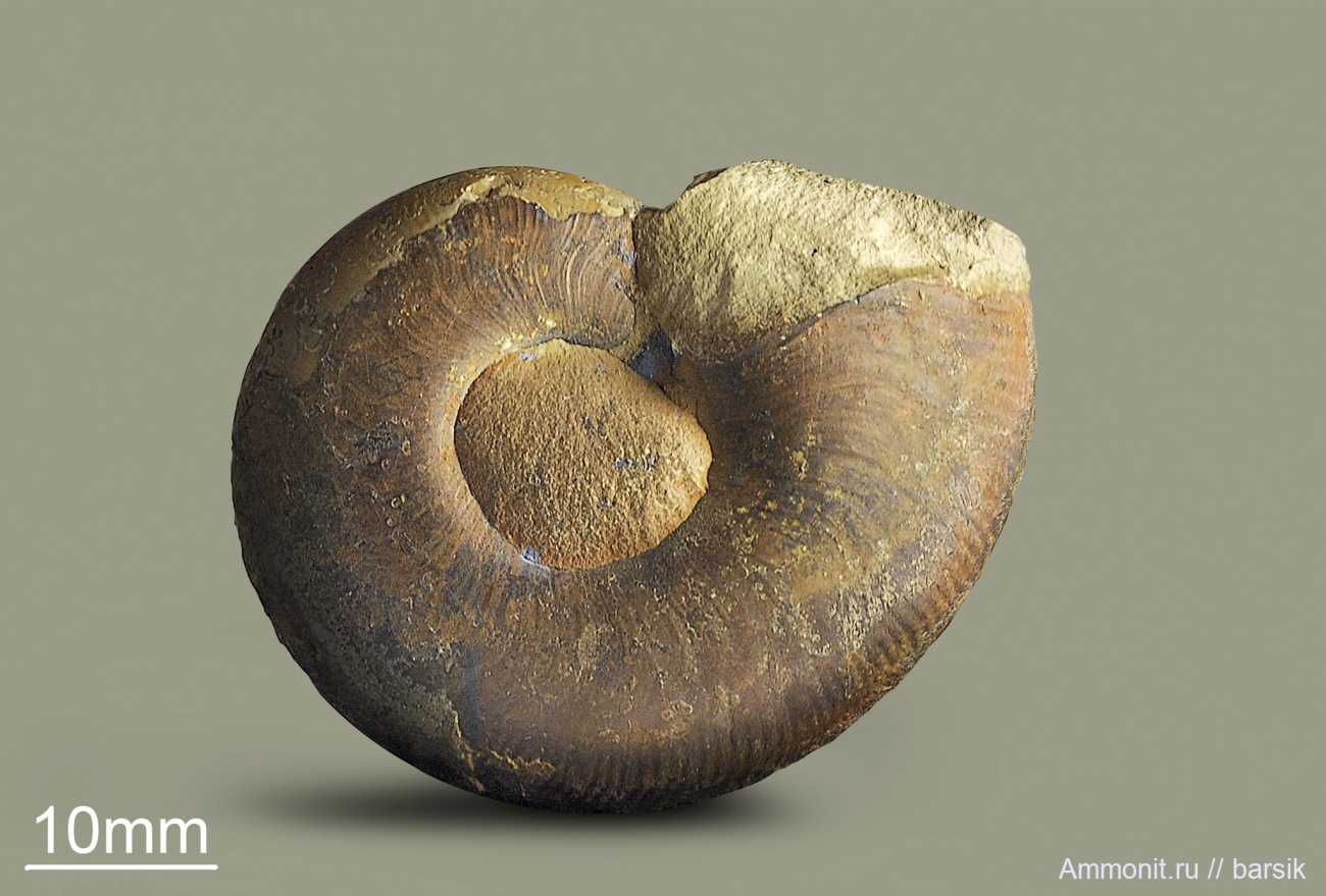 Пока единственный образец из разреза. Интересно и то, что при своих скромных размерах – это макроконх. Самцы должны быть гораздо мельче - 1-1.5см. Нижняя часть зоны Parkinsonia parkinsoni (подзона Acris [=Subarietis]) верхнего байоса р. Кяфар.