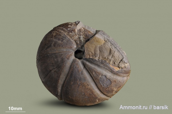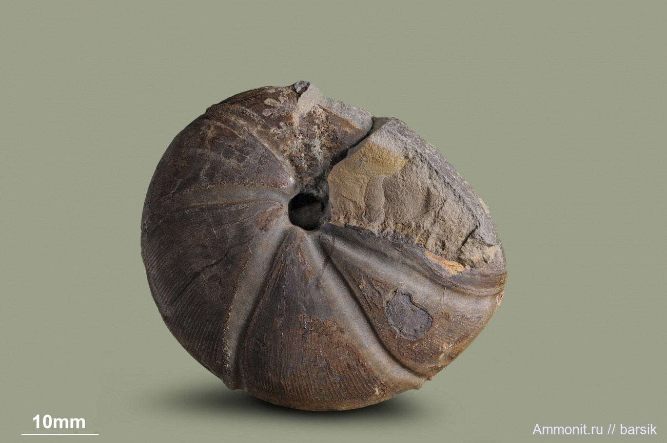 Филоцератиды и литоцератиды редко встречаются в байоских слоях. Считаются обитателями более глубоких горизонтов с толстыми и прочными раковинами. Это относительно целый слепок, хорошо видно и пережимы и мелкие нитевидные ребра на жилой камере. Пупок очень глубокий, почти с отвесными стенками, устье прямое с небольшими боковыми выступами. Нижняя часть зоны Parkinsonia parkinsoni (подзона Acris [=Subarietis]) верхнего байоса р. Кяфар.