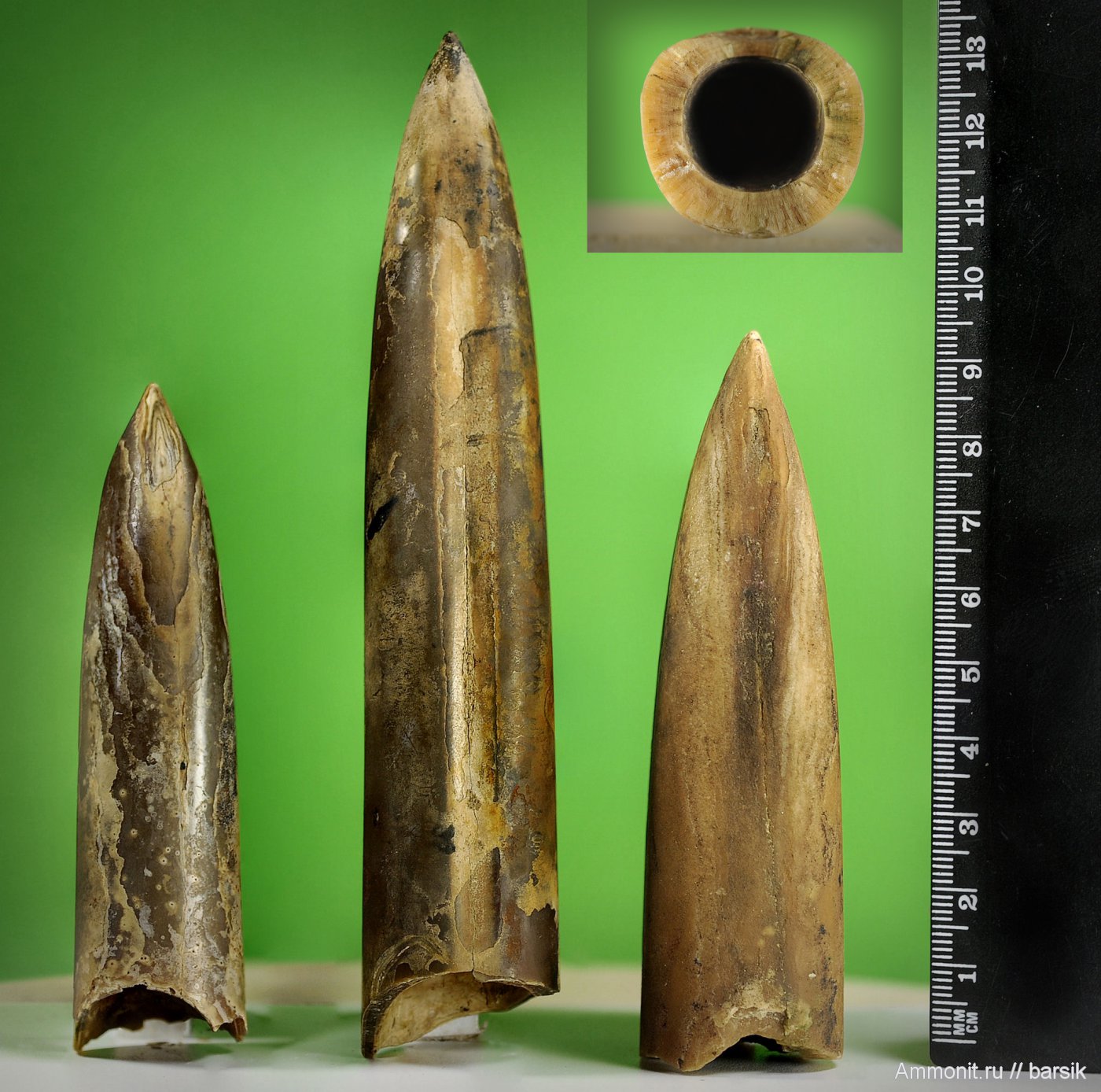 Это крупные ростры с поперечным сечением, которое ближе к квадратному, с cглаженными углами. Возможно, кто- то их них относится к роду Pachyteuthis. Брюшная полоса у двух крайних, начинается от острия и достаточно короткая, у среднего – длинная с четким выраженным окончанием. При таком, крупном сечении, эти ростры не тяжелые, за счет того, что альвеольная часть начинается очень близко к острому концу. В отличие от предыдущего снимка, белемниты с этими рострами, наверное, имели короткое и плотное тело.
