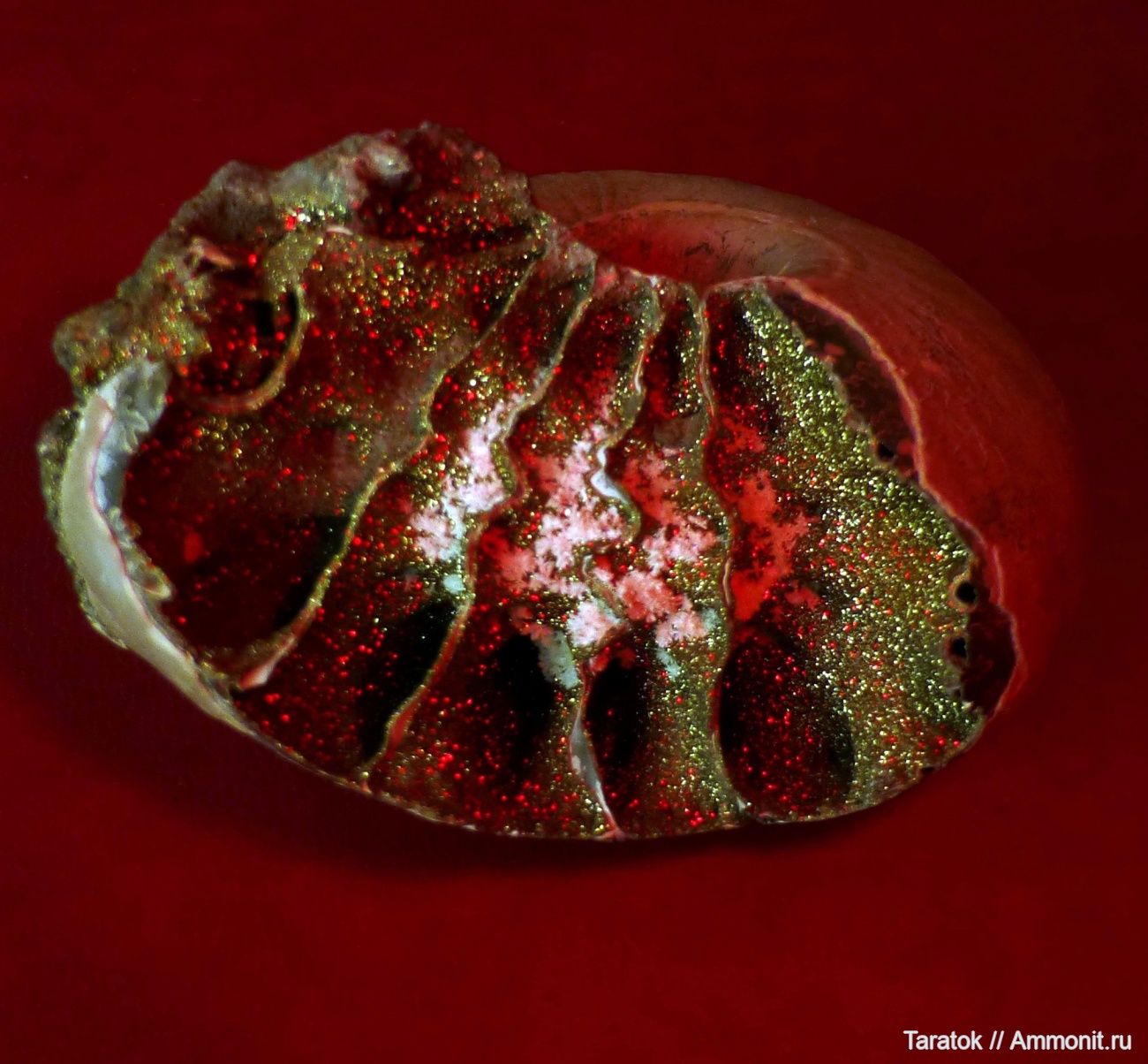 пирит само-сабой, а вот у центра раковины, как раз белые - кальцитовые кристаллы, которые видны как светло-розовыё налет | ||||||