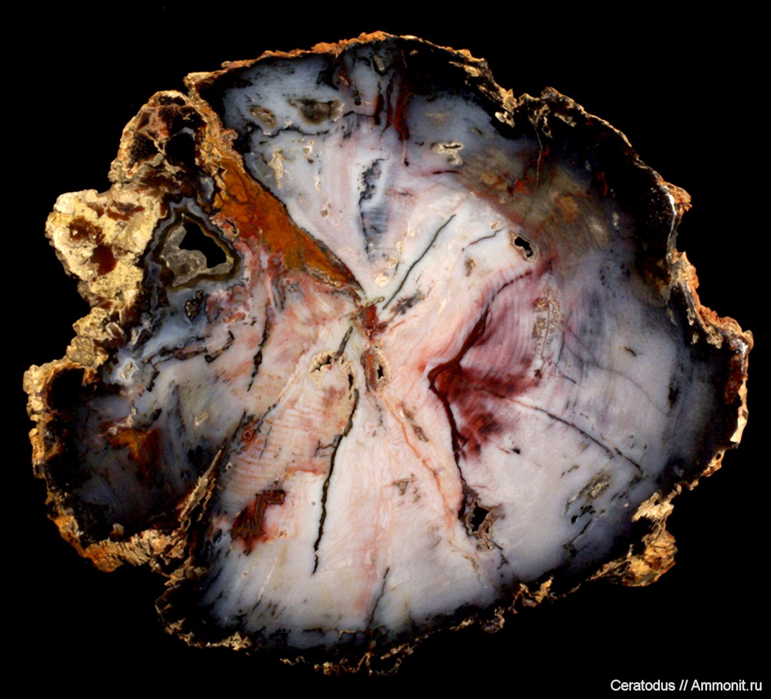 Практически полностью агатизированный образец древнего хвойного дерева из местонахождения Hubbard Basin, Невада. Размер образца 22х19 см, толщина 1 см.