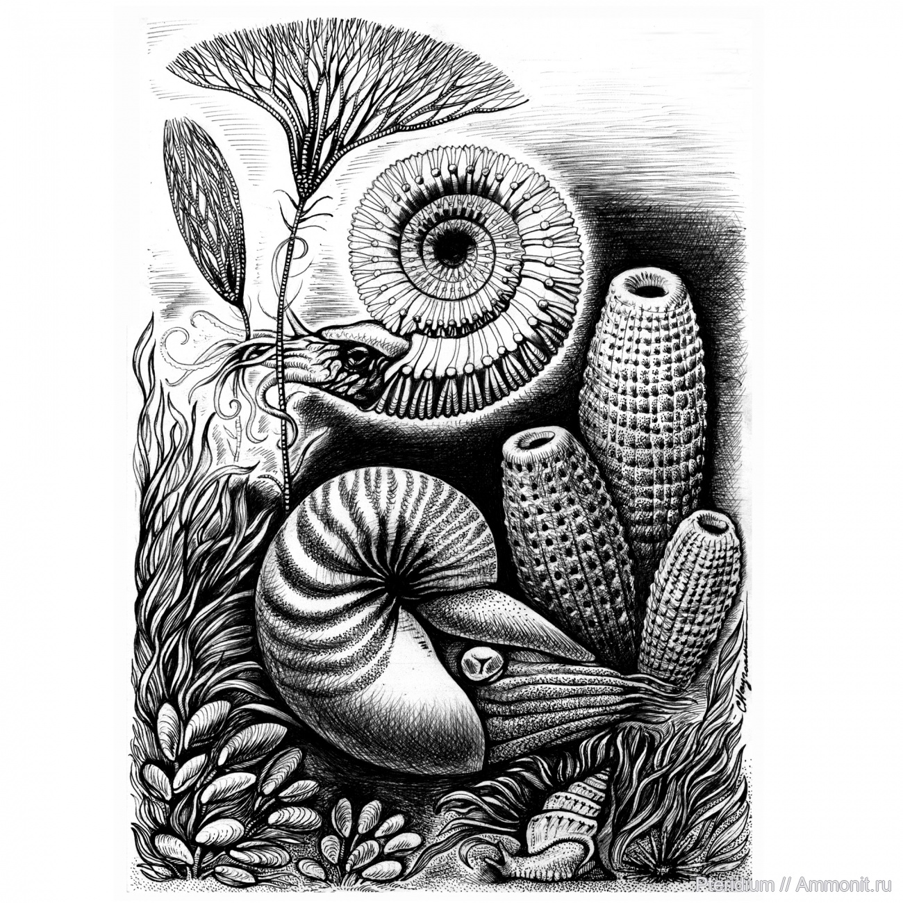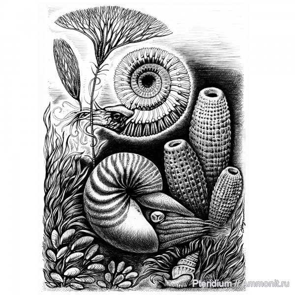 Замечательный рисунок, спасибо что опубликовали его здесь! И аммонит и наутилус на месте, только прямораковинного аулакоцерида не хватает )) | ||||||