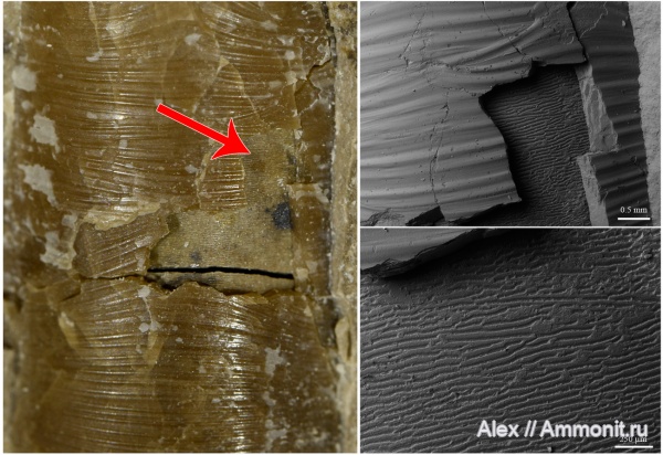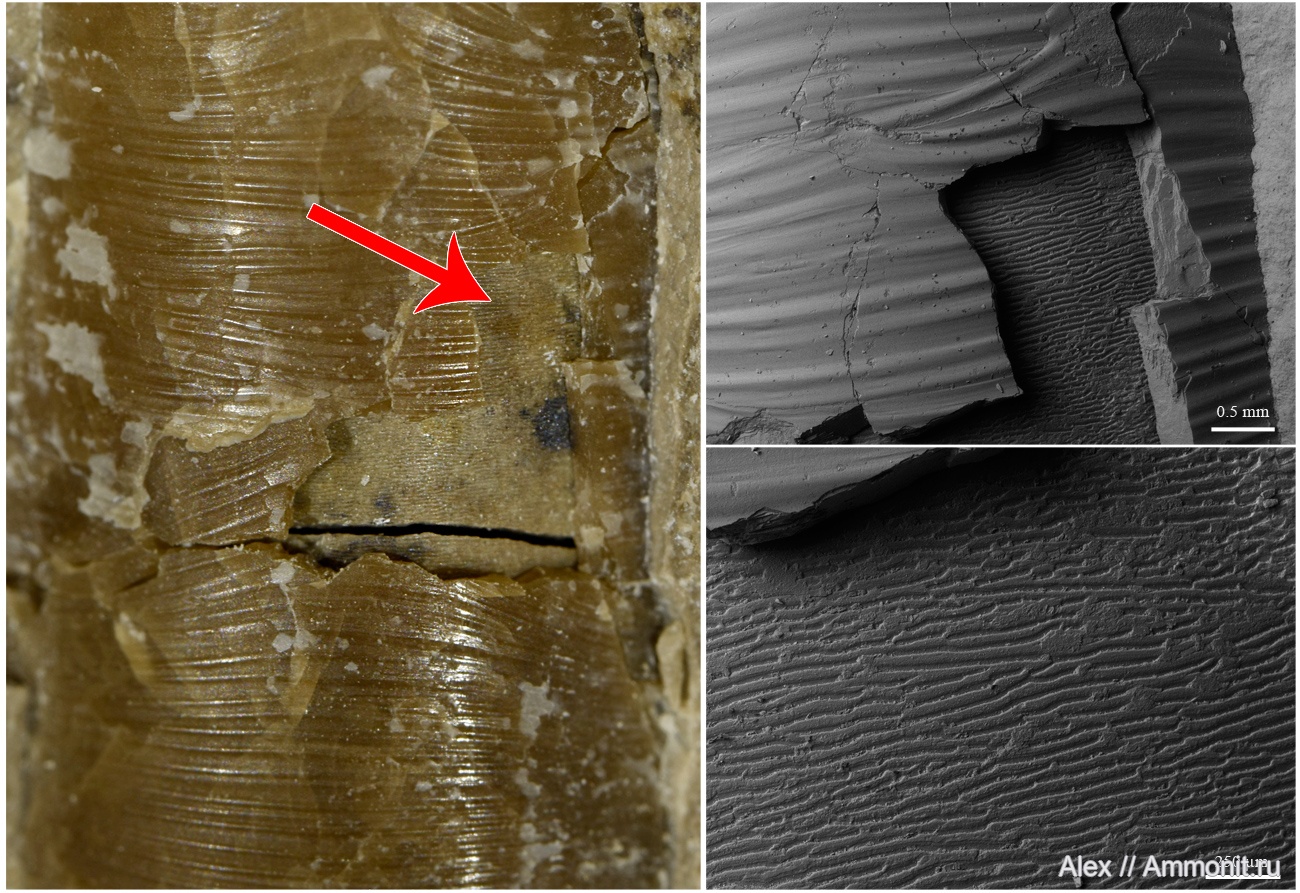 Нам он не привычен, потому что у современных наутилусов от него остался только черный участок на поверхности предпоследнего оборота (и то, его часто стирают перед продажей раковин) и тонкая полоска вдоль устья у взрослых особей. А у древних головоножек - ортоцерид, тарфицерид, и у аммоноидей он полностью или почти полностью выстилал жилую камеру. Нужно это было для того, чтобы моллюск мог легко и быстро втягиваться внутрь жилой камеры. У современных наутилусов жилые камеры короткие, а мускулы-ретракторы - сильные, у них проблем с втягиванием нет, но у многих наутилоидей и ретракторы были послабее, и ЖК подлиннее, и морщинистый слой имел для них большое значение. Так что если бы мы на берегу пермского моря нашли раковину недавно умершего долортоцераса и заглянули бы в нее, то вместо перламутра мы бы увидели темный органический слой, выстилающий стенки раковины.