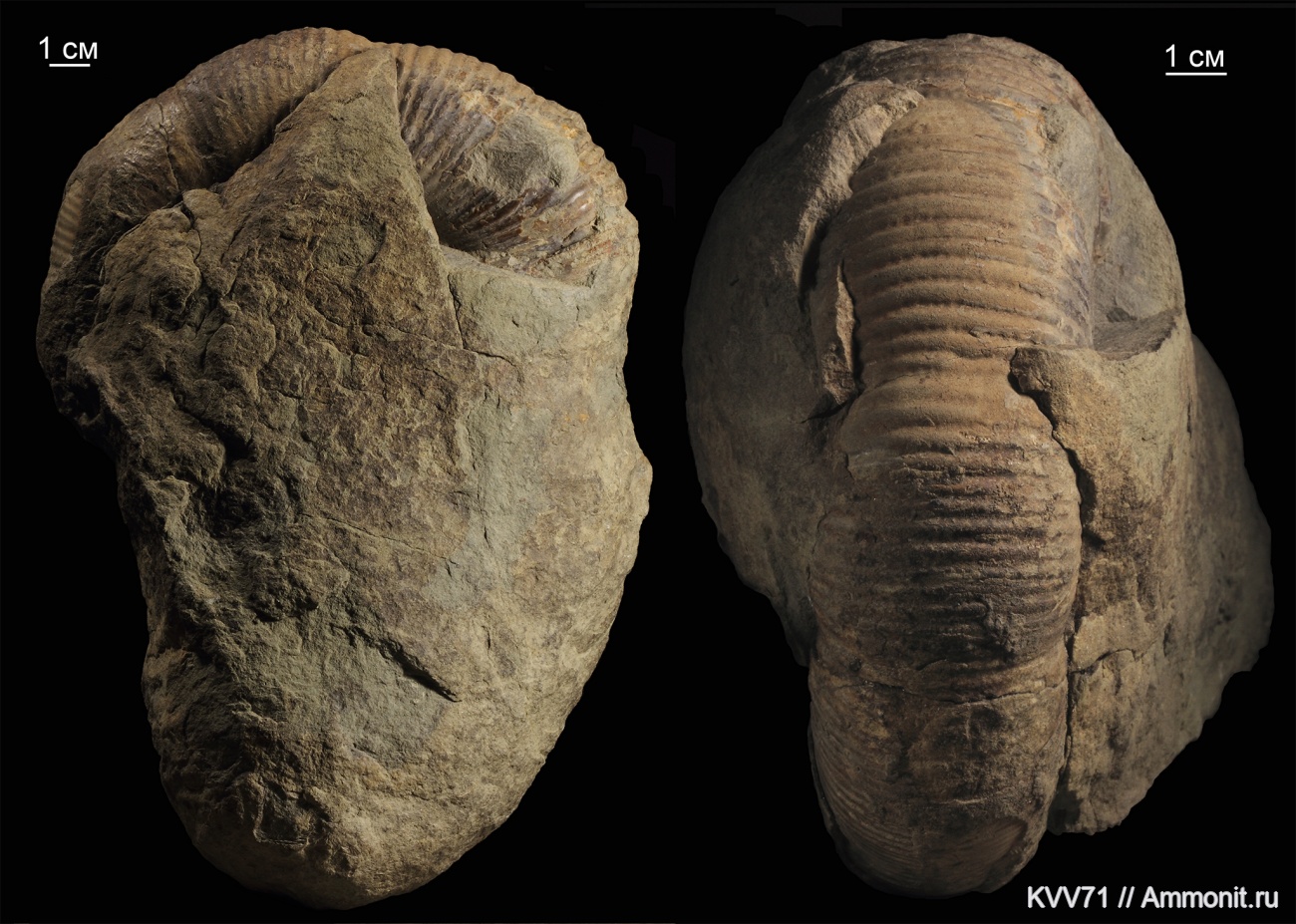 Аммонит абсолютно целый, с устьем, раскрыт по вентру на 230 градусов. Просматривается вся скульптура раковины, ребра, пережимы, строение устья, отпечатки воротников на ядре и на остатках раковины в виде выступающих полос.