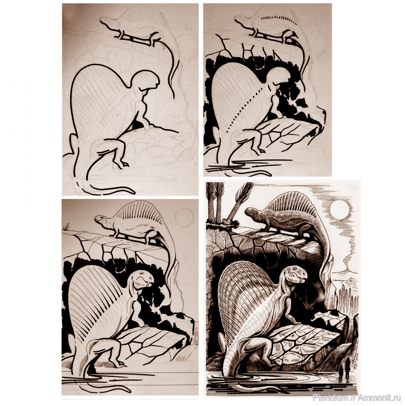 С интересом рассматривала Ваши замечательные иллюстрации в книгах, а теперь удалось познакомиться с техникой создания работ. Спасибо. Итоговый (4-й) рисунок обработан на компьютере? | ||||||
