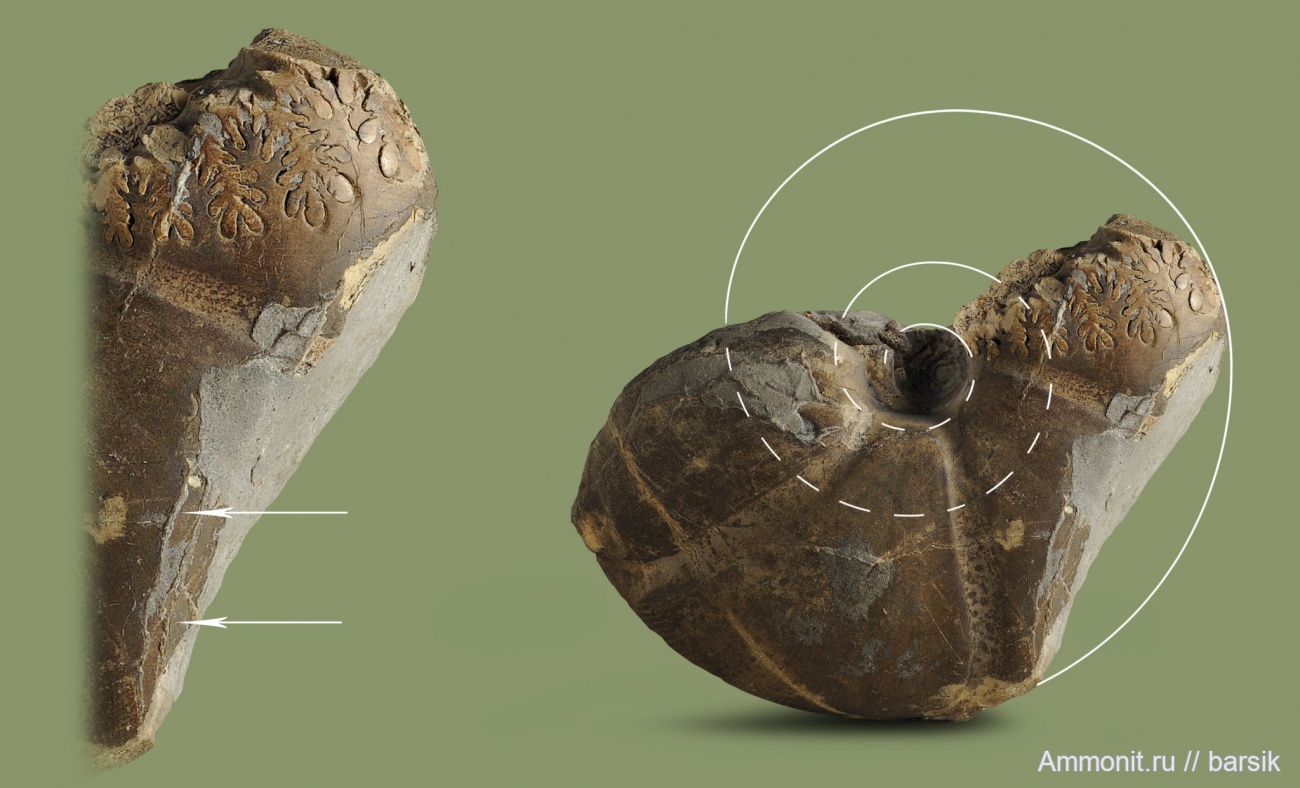 На левой проекции по стрелкам показаны надломленные участки. Они остались рядом и это, скорее всего, говорит о том, что на дно опускалась уже пустая раковина и осколки образовались уже в процессе заполнения ЖК породой и формированием конкреции. В любом другом случае при ударе о прибрежные камни, эти осколки вымылись и потерялись бы в толще воды.
