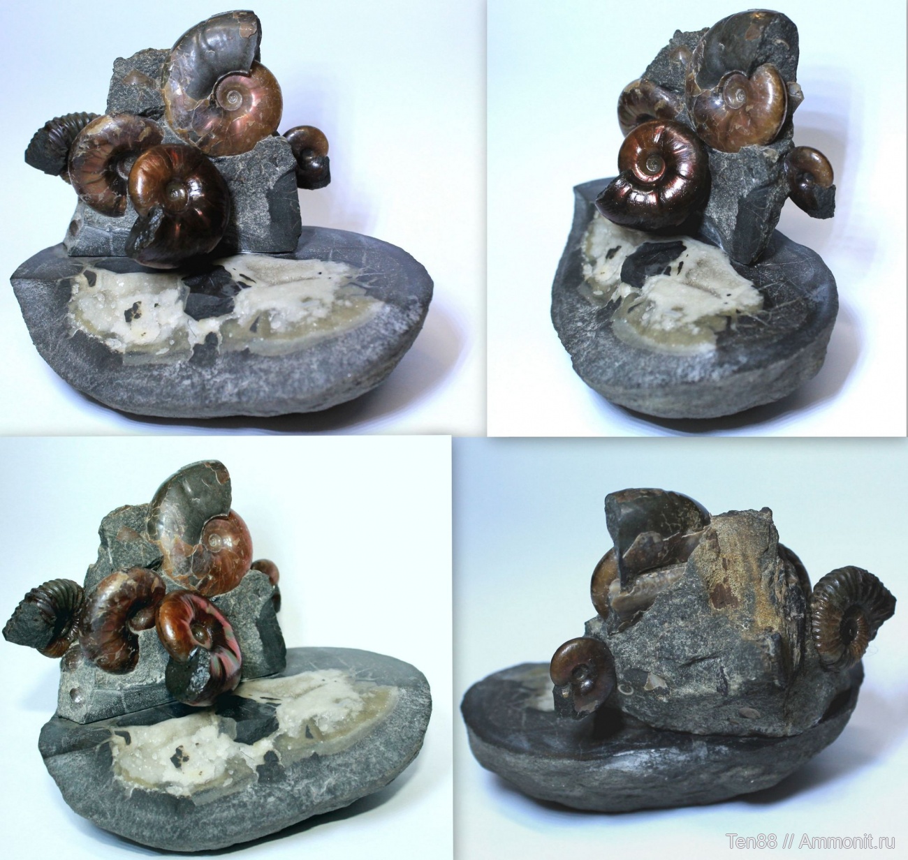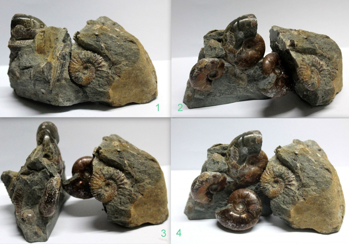 Был фрагмент конкреции. На поверхности торчал чей-то "хвостик" :), сбоку удачно открылся Acanthohoplites и вот при попытке его подчистить, он начал отделяться от основной массы вместе с кусочком породы Фото (фото1). Решила их разделить и ...а там-то еще кое-кто прятался (фото2,3). Как говорится - нет худа без добра :). И вот практически все обитатели этого небольшого кусочка были на месте (фото 4). Правда при удалении боковинки камушка еще нарисовался и малышок. Было принято решение двух товарищей пересадить на свои места на большую часть камня. Ну и что получилось Вы видите на главном фото. Acanthohoplites - 2.6 см., верхний ( с немного утраченным перламутром) Desmoceratidae -3.5 см., слева - 2.9 см., по центру-3 см. и малышок -1.7 см.