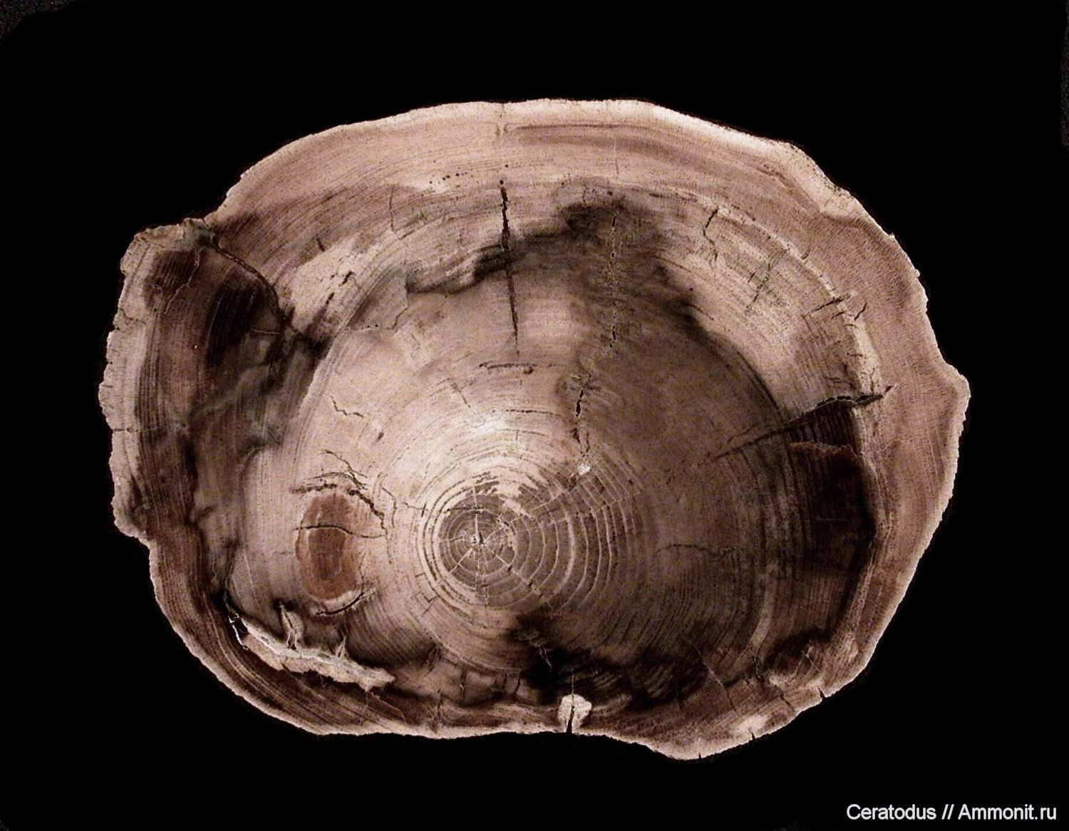 Лиственное дерево из месторонахождения McDermitt, штат Орегон. Образец характеризуется хорошей сохранностью структуры древесины. Размер образца 18х13 см, толщина 8 мм.
