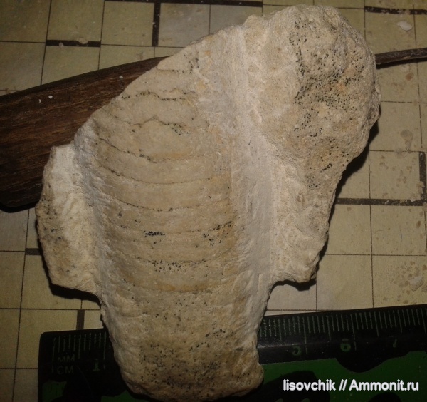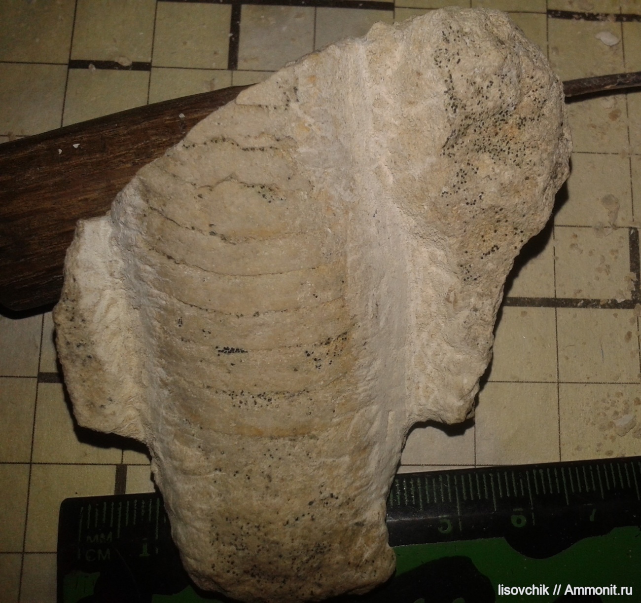 Фрагмент наутилоидеи Rayonnoceras. В породе он может быть и не целый, они часто растворены с одной стороны. | ||||||