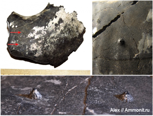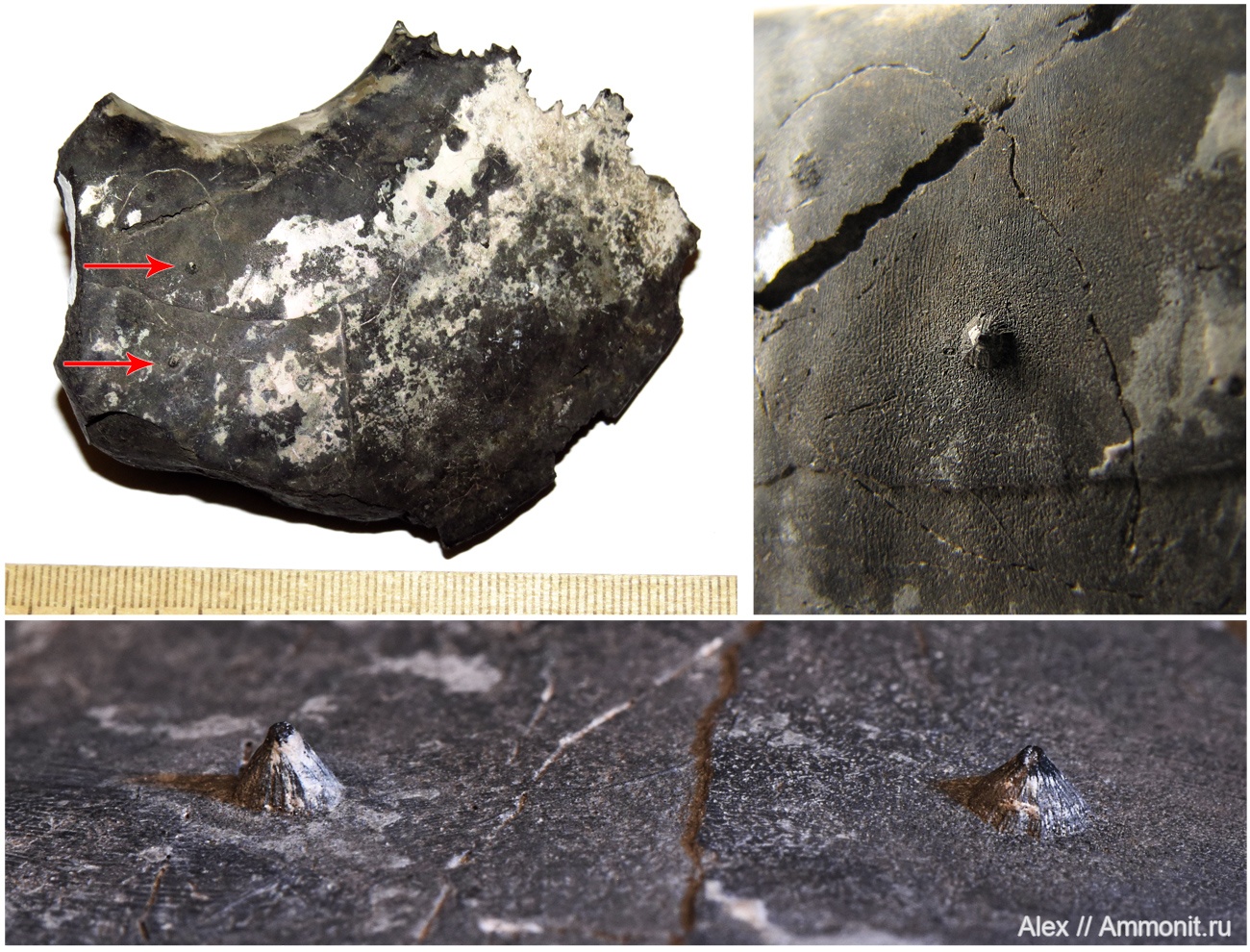 Конеллы-пробалянусы всегда сидят не на раковине, а на ядре аммонитов и выполнены из той же породы, что и ядро. Их размеры варьируют от долей миллиметра до 2-3 мм. Судя по всему, высота конелл равна толщине стенки раковины в месте их образования. Поверхность их покрыта более или менее выраженными продольными ребрами, вершина чаще всего отсутствует. Иногда они встречаются по-отдельности, как на этой жилой камере Amoeboceras из Рыбаков, но иногда попадаются большими "стайками".