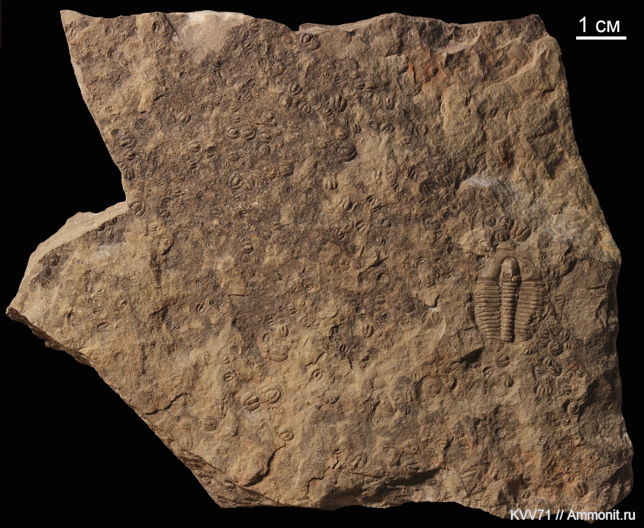 Образец из состоит двух плиток, расколотых вдоль плоскости отложения, самого трилобита и контротпечатка. Низ нижней плитки, многочисленные агностиды Фото, верх нижней плитки - основное фото, низ верхней плитки - контротпечаток Фото и верх ее - смена условий осадконакопления, граница слоев, плоскость, где агностиды почти пропадают.